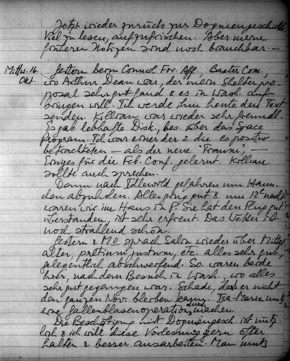 Gestern beim Council For. Aff., Baxter Com., wo Arthur Dean war, der mein Shelter proposal sehr gut fand & es in Wash. aufbringen will. Ich werde ihm heute den Text senden. Killian war wieder sehr freundl. Es gab lebhafte Disk., bes. über das Space Program. Ich war einer der 2 die es positiv betrachteten als der neue "Traum". Einiges für die Feb. Conf. gelernt. Killian sollte auch sprechen.