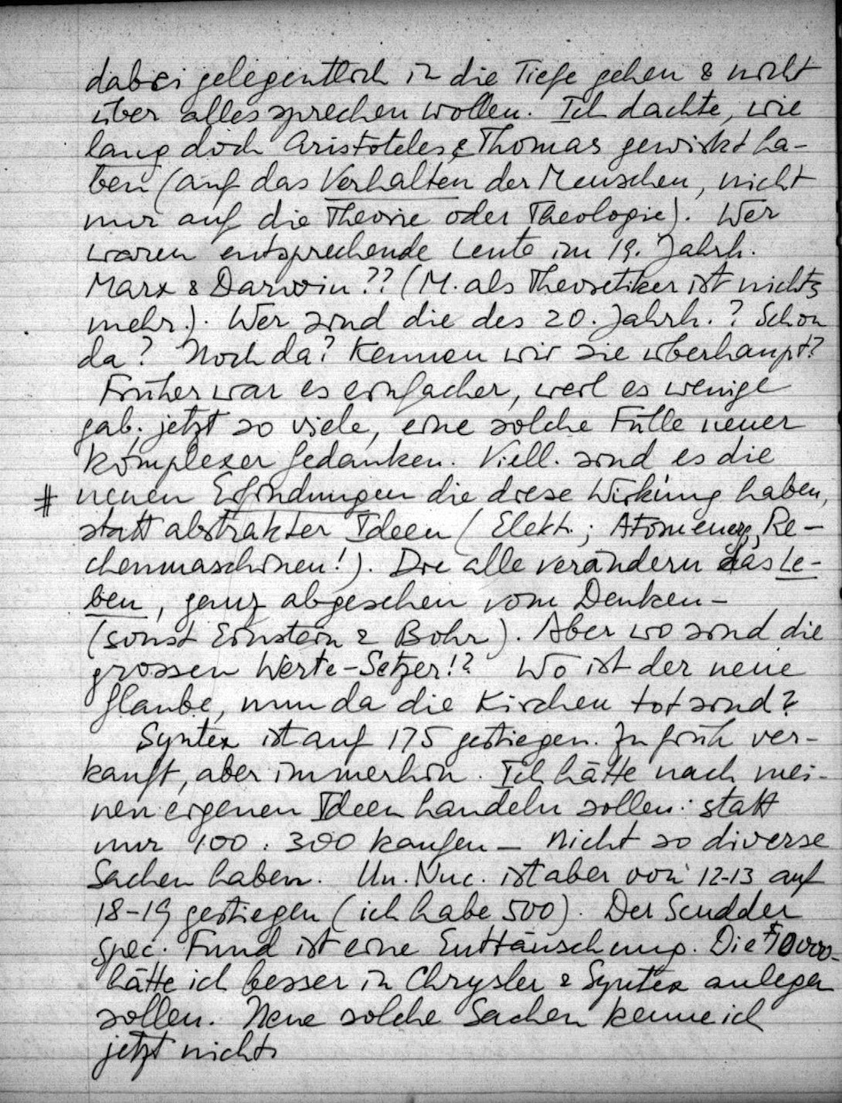 Syntex ist auf 175 gestiegen. Zu früh verkauft, aber immerhin. Ich hätte nach meinen eigenen Ideen handeln sollen: statt nur 100 : 300 kaufen nicht so diverse Sachen haben. Un. Nuc. ist aber von 12-13 auf 18-19 gestiegen (ich habe 500). Der Scudder spec. Fund ist eine Enttäuschung. Die $ 10 000,- hätte ich besser in Chrysler & Syntex anlegen sollen. Neue solche Sachen kenne ich jetzt nicht.