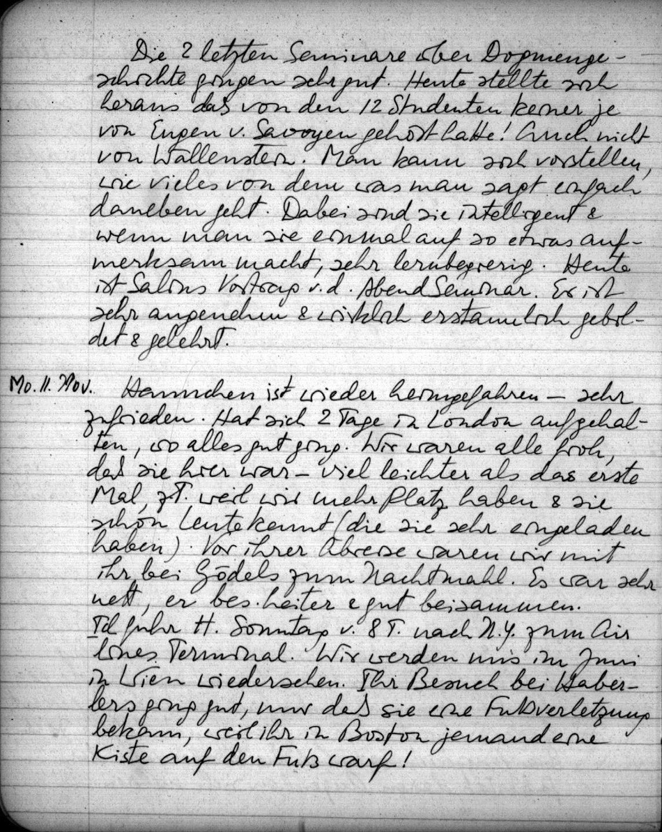 Hannchen ist wieder heimgefahren sehr zufrieden. Hat sich 2 Tage in London aufgehalten, wo alles gut ging. Wir waren alle froh, daß sie hier war viel leichter als das erste Mal, z.T. weil wir mehr Platz haben & sie schon Leute kennt (die sie sehr eingeladen haben). Vor ihrer Abreise waren wir mit ihr bei Gödels zum Nachtmahl. Es war sehr nett, er bes. heiter & gut beisammen.