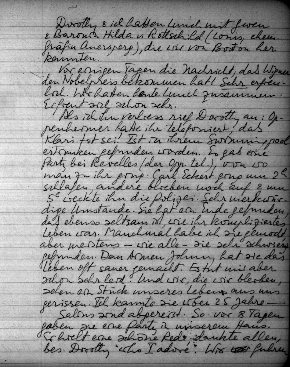 Als ich ihn verliess rief Dorothy an: Oppenheimer hatte ihr telefoniert, daß Klari tot sei! Ist in ihrem Swimmingpool ertrunken gefunden worden. Es gab eine Party bei Revelles (der Opp. tel.), von wo man zu ihr ging. Carl Eckert ging um 2h schlafen, andere blieben noch auf & um 5h weckte ihn die Polizei. Sehr merkwürdige Umstände. Sie hat ein Ende gefunden, daß ebenso seltsam ist, wie ihr kompliziertes Leben war. Manchmal habe ich sie gemocht, aber meistens wie alle sie sehr schwierig gefunden. Dem Armen Johnny hat sie das Leben oft sauer gemacht. Es tut mir aber schon sehr leid. Und wird, die wir bleiben, sehen ein Stück unseres Lebens aus uns gerissen. Ich kannte sie über 25 Jahre.