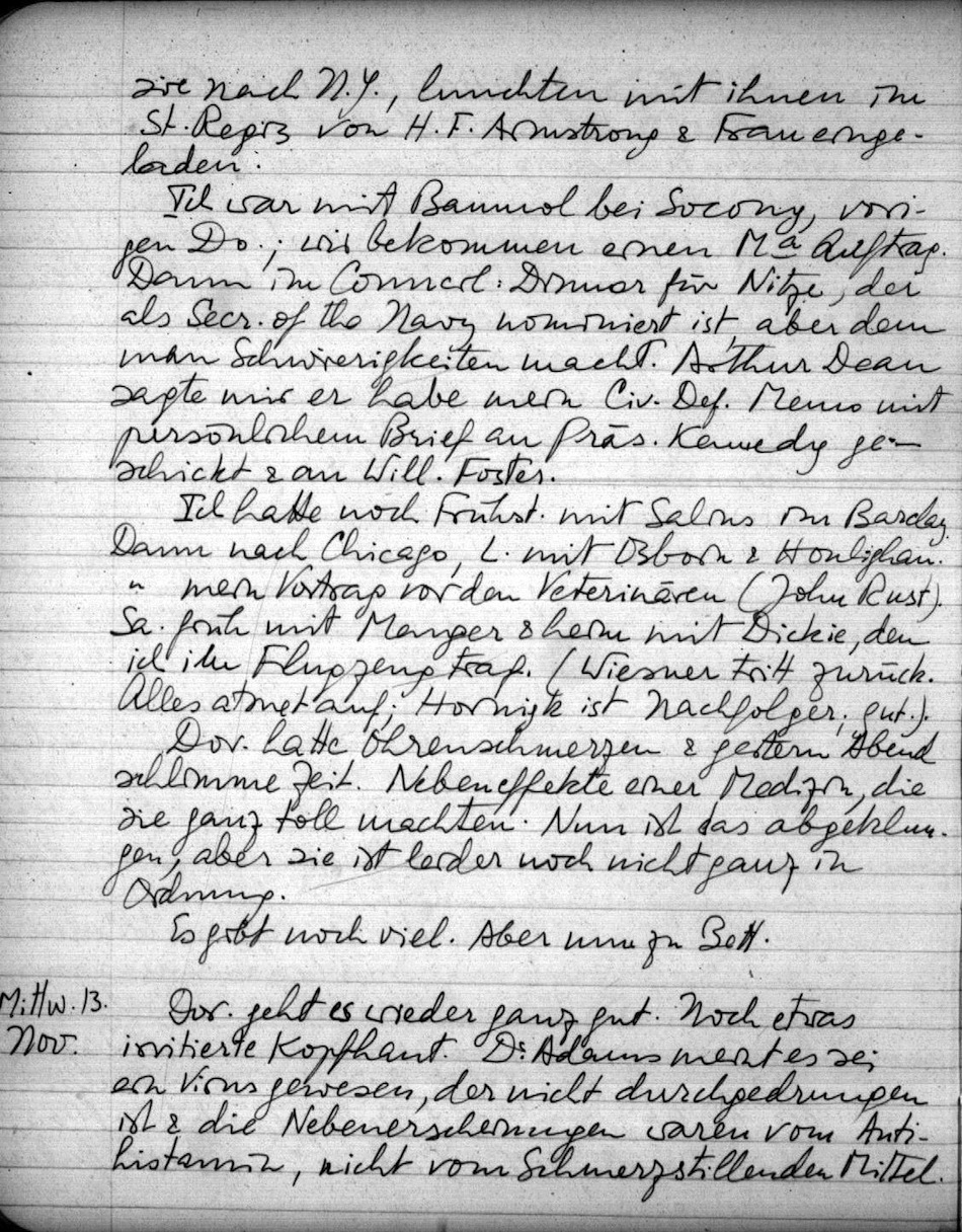 Ich war mit Baumol bei Socony, vorigen Do.; wir bekommen einen Ma Auftrag. Dann im Council: Dinner für Nitze, der als Secr. of the Navy nominiert ist, aber dem man Schwierigkeiten macht. Arthur Dean sagte mir er habe mein Civ. Def. Memo mit persönlichem Brief an Präs. Kennedy geschickt & an Will. Foster.