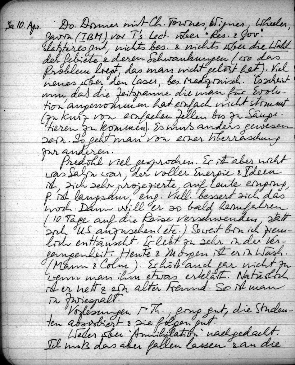 Do. Dinner mit Ch. Townes, Wigner, Wheeler, Gavin (IBM) vor T's Lect. über "Res. & Gov.". Letzteres gut, nichts bes. & nichts über die Wahl der Gebiete & deren Schwankungen (wo das Problem liegt, das man nicht gelöst hat). Viel neues über den Laser, bes. Medizinisch. Es scheint nun, daß die Zeitspanne die man für Evolution angenommen hat einfach nicht stimmt (zu kurz von einfachen Zellen bis zu Säugetieren zu kommen). Es muß anders gewesen sein. So geht man von einer Überraschung zur anderen.