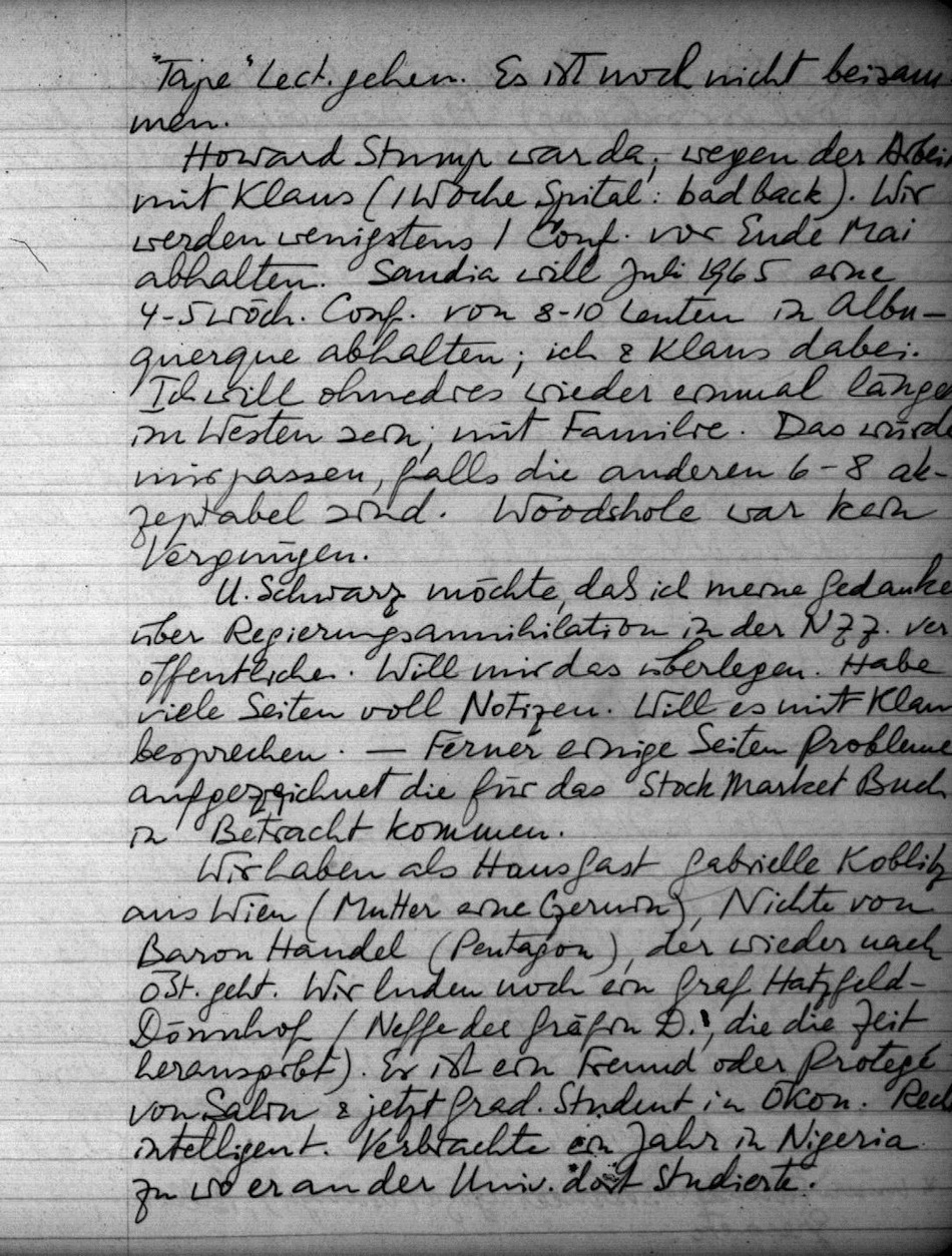 Howard Stump war da; wegen der Arbeit mit Klaus (1 Woche Spital: bad back). Wir werden wenigstens 1 Conf. vor Ende Mai abhalten. Sandia will Juli 1965 eine 4-5 wöch. Conf. von 8-10 Leuten in Albuquerque abhalten; ich & Klaus dabei. Ich will ohnedies wieder einmal länger im Westen sein; mit Familie. Das würde mir passen, falls die anderen 6-8 akzeptabel sind. Woodshole war kein Vergnügen.