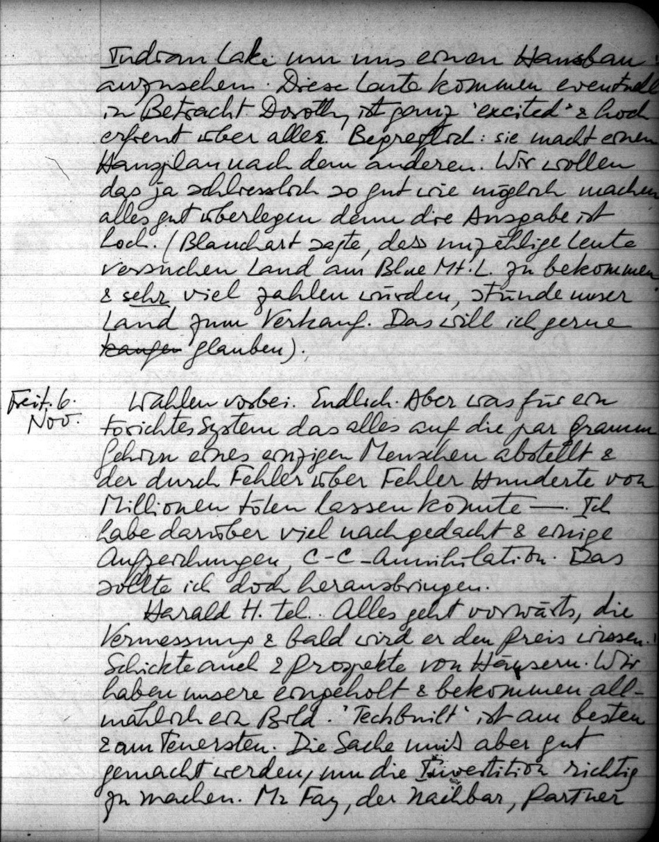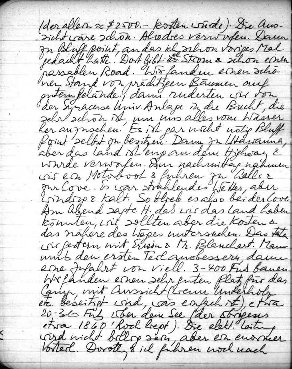 Dann traf ich mich mit Dorothy in Newark & wir flogen nach Utica & dann mit Auto (Regen & Nebel) nach Blue Mt. Lake. Dinner mit Harald & Mary in ihrem Haus (wir im Gast-Haus). Sehr nett. Freitag war etwas Schnee, der aber in der Sonne verschwand. Mit Harald gingen wir zuerst zu dem Land jenseits der Aalls. Es ist kompliziert, unser Weg würde hoch über das Gelände gelegt werden müssen, lang & teuer sein, dazu noch Generator (der allein $ 2 500,- kosten würde). Die Aussicht wäre schön. Also dies verworfen. Dann zu Bluff Point, an das ich schon voriges Mal gedacht hatte. Dort gibt es el. Strom & schon einen passablen Road. Wir fanden einen schönen Stand von prächtigen Bäumen auf gutem Gelände; dann ruderten wir von der Synacuse Univ. Anlage in die Bucht, die sehr schön ist, um uns alles vom Wasser her anzusehen. Es ist gar nicht nötig Bluff Point selbst zu besitzen. Dann zu Utawanna, aber das Land ist eng an dem Highway & wurde verworfen. Am nachmittag nahmen wir ein Motorboot und fuhren zu Aalls & zur Cove. Es war strahlendes Wetter, aber windig & kalt. So blieb es also bei der Cove. Am Abend sagte H. daß wir das Land haben könnten, wir sollten aber die Kosten & das nähere des Weges untersuchen. Das taten wir gestern mit Erwin & Mr. Blanchart. Man muß den ersten Teil ausbessern, dann eine Zufahrt von viell. 3-400 Fuß bauen. Wir fanden einen sehr guten Platz für das Camp, mit Aussicht (wenn Unterholz etc. beseitigt wird, was einfach ist), etwa 20-30 Fuß über dem See (der übrigens etwa 1860' hoch liegt). Die elekt. Leitung wird nicht billig sein, aber ein enormer Vorteil. Dorothy & ich fuhren noch nach Indian Lake um uns einen Hausbau anzusehen. Diese Leute kommen eventuell in Betracht. Dorothy ist ganz "excited" & hoch erfreut über alles. Begreiflich: sie macht einen Hausplan nach dem anderen. Wir wollen das ja schliesslich so gut wie möglich machen, alles gut überlegen denn die Ausgabe ist hoch. (Blanchart sagte, dass unzählige Leute versuchen Land am Blue Mt. L. zu bekommen & sehr viel zahlen würden, stünde unser Land zum Verkauf. Das will ich gerne glauben.)