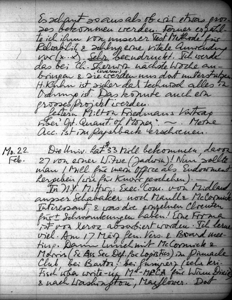 Heute kam unerwartet Dr Gerry Johnson von Livermore. Wir 2 hatten eine lange Besprechung in Ma, über Deterrence, Strat., Verwundbarkeit von Systemen & Maschinen usw. Sie wollen sich mehr mit uns beschäftigen & Ma wird einen Contract ähnlich wie mit Sandia bekommen. Er ist Dir. des Plowshare Progr. & hat $ 18 Mill. Budget dieses Jahr. Nun will er viell. für uns $ 10 000,- aufwenden um zu helfen die Ökon. Auswirkungen zu untersuchen (Pollution, Kupfer, Erdgasproduktion usw.). Das Program könnte riesige Dimensionen annehmen & wir sollen es studieren. Es schaut so aus als ob wir etwas grosses bekommen werden. Ferner erzählte ich ihm von unserer Test Methode für Reliabilität & schlug eine vitale Anwendung vor (x x). Sehr beeindruckt. Ich werde das bei Ch. Sherwin nächste Woche anbringen & sie werden uns dort unterstützen. H. Kuhn ist sicher daß technisch alles in Ordnung ist. Das könnte auch ein grosses Projekt werden.