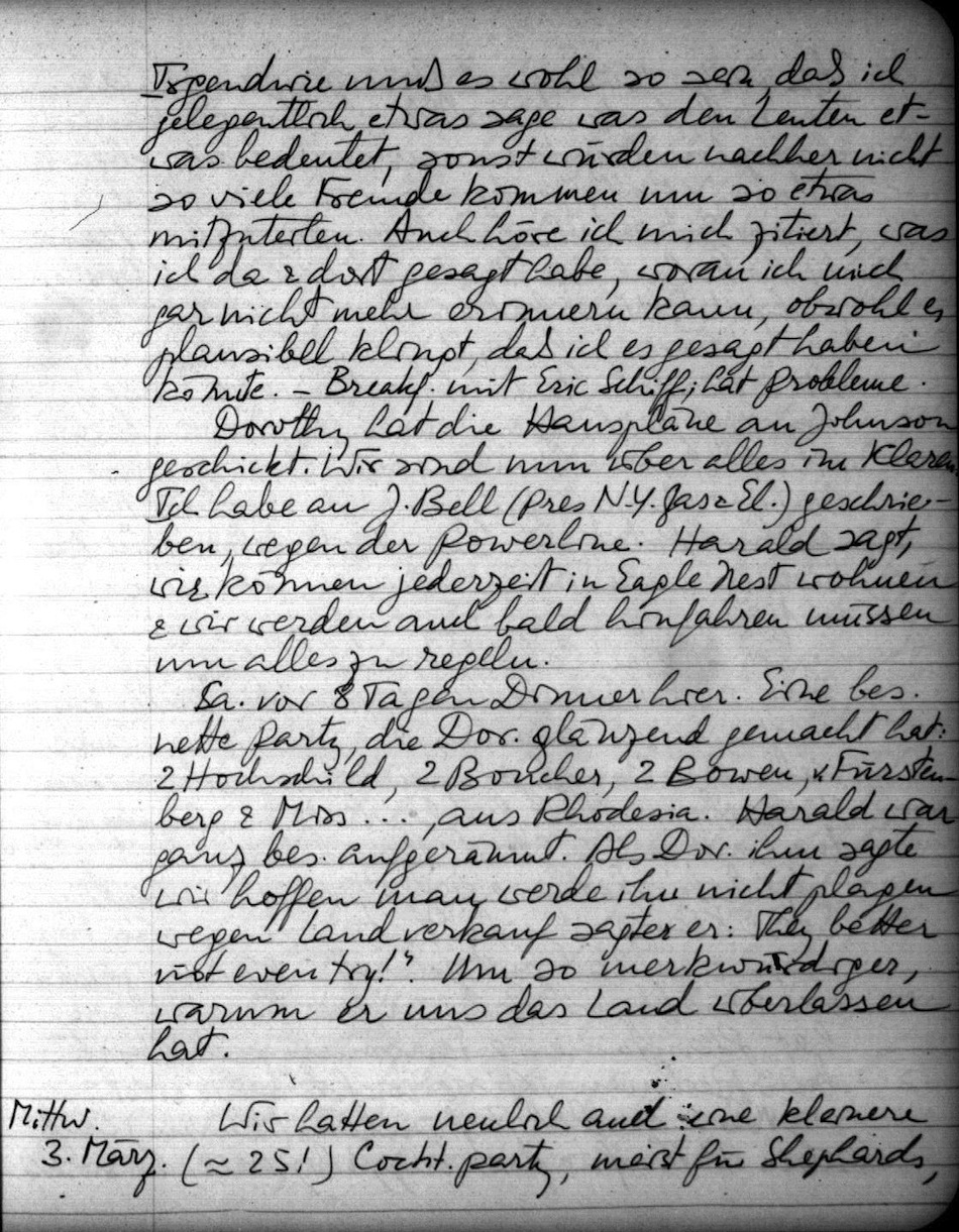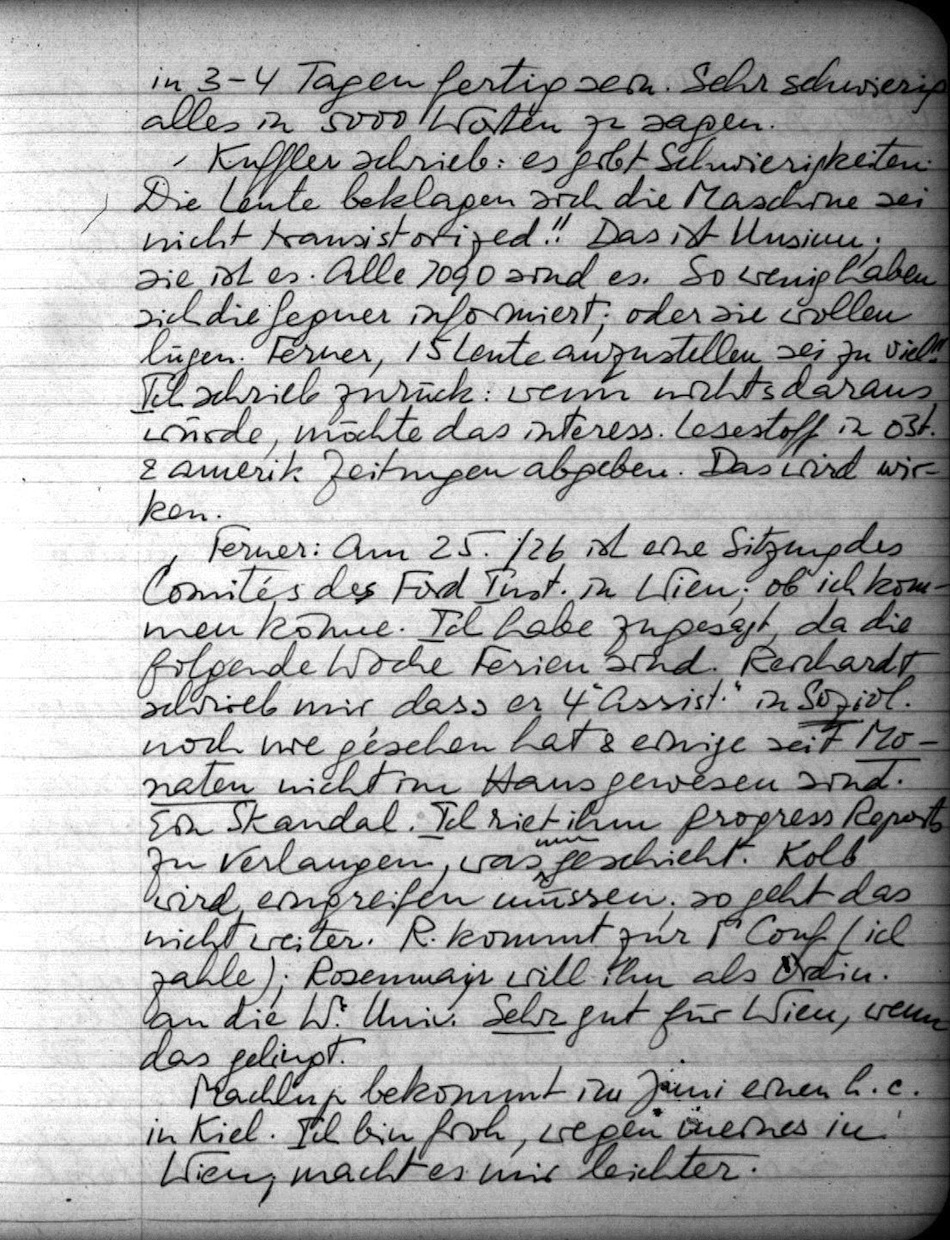 Ferner: Am 25./26. ist eine Sitzung des Comités des Ford Inst. in Wien; ob ich kommen könne. Ich habe zugesagt, da die folgende Woche Ferien sind. Reichardt schrieb mir dass er 4 "Assist." in Soziol. noch nie gesehen hat & einige seit Monaten nicht im Haus gewesen sind. Ein Skandal. Ich riet ihm Progress Reports zu verlangen, was nun geschieht. Kolb wird eingreifen müssen; so geht das nicht weiter. R. kommt zur G Conf. (ich zahle); Rosenmayr will ihn als Ordin. an die Wr Univ. Sehr gut für Wien, wenn das gelingt.