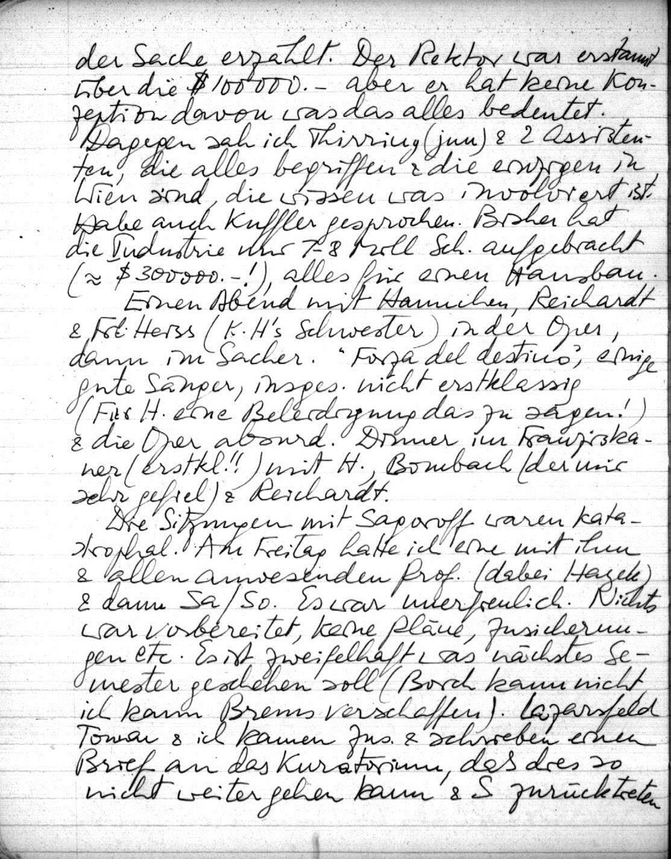 Sehr viel los gewesen: Midl. Sitzung, MRCA Exec. Com., Lunch in N.Y. mit Min. Krone (Bonn, Nationalist, ) Flug nach Wien (vorher Kamitz im H. Regency wegen des Instituts) mit Aufenthalt bei Vosslers & Lunch mit ihnen am Flugplatz. In Wien im Sacher, vorher D. mit Hannchen, der es ganz passabel geht. Fr. bei Fin. Min. Schmidt, beim Rektor Fehlinger (& Pro-R. Lepski) (& Hanau von I.B.M.). Die Rektorenkonf. hat abgelehnt (!!) aber der Senat der Univ. hat angenommen. Nun muß man sehen, ob doch eine der IBM passende Formel gefunden werden kann. Mr. Gygax ist diese Woche in Wien gewesen & ich werde bald von ihm hören. Den Unterr. Min. habe ich nicht gesehen, aber sowohl den Fin. Min. & Kreisky von der Sache erzählt. Der Rektor war erstaunt über die $ 100 000,- aber er hat keine Konzeption davon was das alles bedeutet. Dagegen sah ich Thirring (jun) & 2 Assistenten, die alles begriffen & die einzigen in Wien sind, die wissen was involviert ist. Habe auch Kuffler gesprochen. Bisher hat die Industrie nur 7-8 Mill. Sch. aufgebracht ( $ 300 000,-!), alles für einen Hausbau.