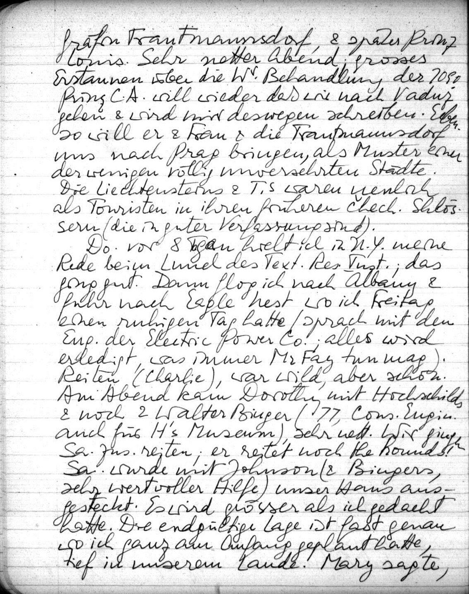 Beim Prinzen Carl Alf v. Liechtenstein zum Dinner. Noch Graf Henkel-Donnersmark, Graf Arco, Graf & Gräfin Trautmannsdorf, & später Prinz Louis. Sehr netter Abend; grosses Erstaunen über die Wr Behandlung der 7090. Prinz C.A. will wieder daß wir nach Vaduz gehen & wird mir deswegen schreiben. Ebenso will er & Frau & die Trautmannsdorf uns nach Prag bringen, als Muster einer der wenigen völlig unversehrten Städte. Die Liechtensteins & T.s waren neulich als Touristen in ihren früheren chech. Schlössern (die in guter Verfassung sind).