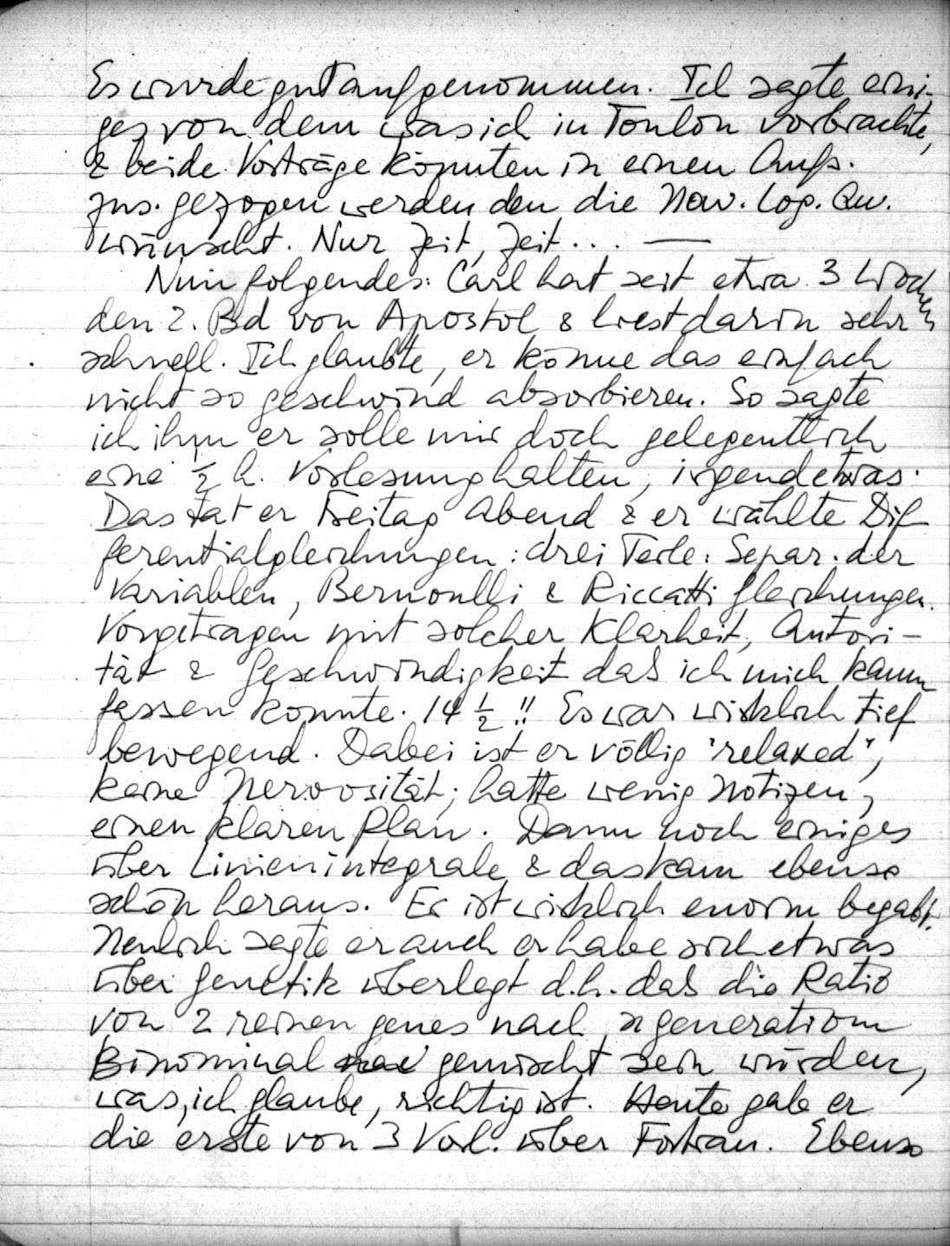 Nun folgendes: Carl hat seit etwa 3 Wochen den 2. Bd. von Apostol & liest darin sehr schnell. Ich glaubte, er könne das einfach nicht so geschwind absorbieren. So sagte ich ihm er solle mir doch gelegentlich eine ½ h Vorlesung halten, irgendetwas. Das tat er Freitag Abend & er wählte Differentialgleichungen: drei Teile: Separ. der Variablen, Bernoulli & Riccatti Gleichungen. Vorgetragen mit solcher Klarheit, Autorität & Geschwindigkeit daß ich mich kaum fassen konnte. 14 ½ !! Es war wirklich tief bewegend. Dabei ist er völlig "relaxed", keine Nervosität; hatte wenig Notizen, einen klaren Plan. Dann noch einiges über Linienintegrale & das kam ebenso schön heraus. Er ist wirklich enorm begabt. Neulich sagte er auch er habe sich etwas über Genetik überlegt d.h. daß die Ratio von 2 reinen genes nach n generatiom binominal gemischt sein würden, was, ich glaube, richtig ist. Heute gab er die erste von 3 Vorl. über Fortran. Ebenso gut getan. Die Freude die das bereitet ist schwer zu beschreiben. Er ist den meisten Grad. Studenten die bei mir öfters vortragen müssen bereits heute überlegen in bezug auf Darstellung. Und Math. kann er mehr als die meisten. Er weiss heute viel mehr als er nächstes Jahr im Calc. Kurs lernen soll. Wir müssen sehen, was wir mit ihm machen. Dabei ist er sonst fein, spielt Guitarre, aber sieht zu Hause keine Freunde; geht aber mit ihnen ins Theater (McBeth, The Birds ) spielt wieder Tennis.