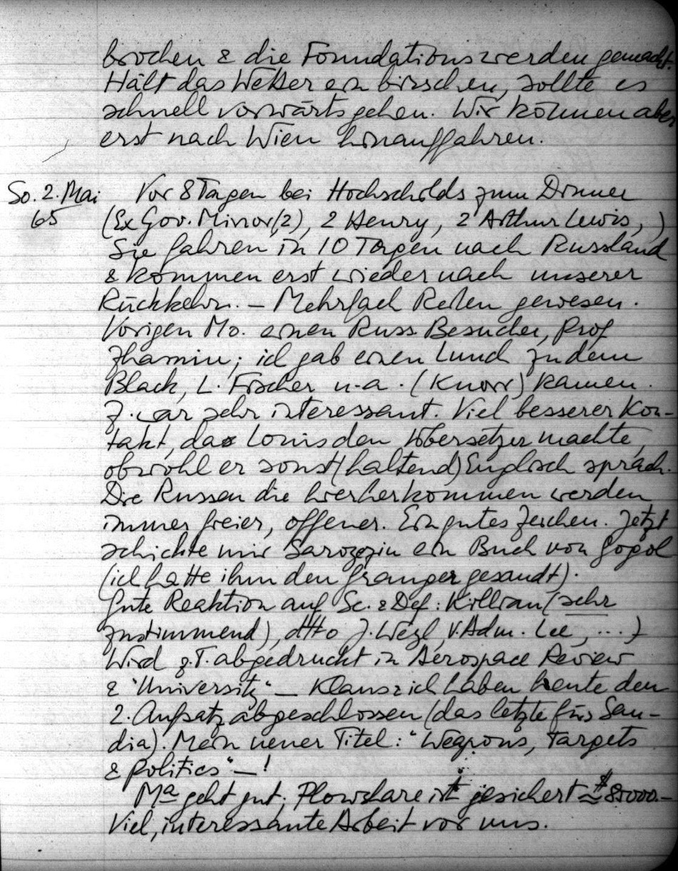 Vor 8 Tagen bei Hochschilds zum Dinner (Ex Gov. Minor (2), 2 Henry, 2 Arthur Lewis). Sie fahren in 10 Tagen nach Russland & kommen erst wieder nach unserer Rückkehr. Mehrfach Reiten gewesen. Vorigen Mo. einen Russ. Besucher, Prof. Zhamiu; ich gab einen Lunch zu dem Black, L. Fischer u.a. (Knorr) kamen. Z. war sehr interessant. Viel besserer Kontakt, da Louis den Übersetzer machte, obwohl er sonst (haltend) Englisch sprach. Die Russen die hierherkommen werden immer freier, offener. Ein gutes Zeichen. Jetzt schickte mir Sarozezin ein Buch von Gogol (ich hatte ihm den Granger gesandt). Gute Reaktion auf Sc. & Def.: Killian (sehr zustimmend), dtto J. Weyl, V. Adm. Lee, ). Wird z.T. abgedruckt in Aerospace Review & "University". Klaus & ich haben heute den 2. Aufsatz abgeschlossen (das letzte für Sadia). Mein neuer Titel: "Weapons, Targets & Politics" - !