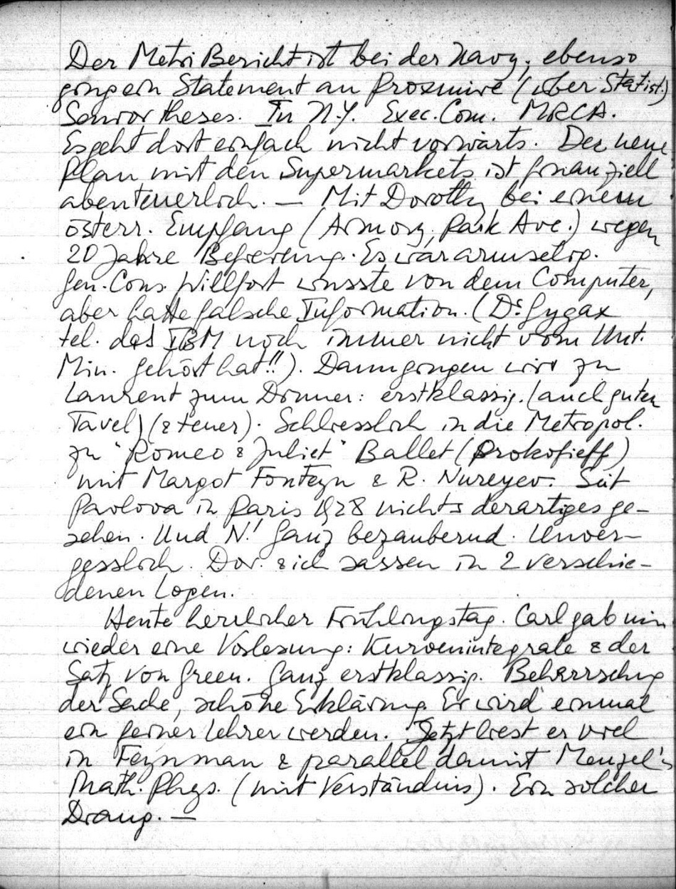 Ma geht gut; Plowshare ist gesichert $ 85 000,-. Viel, interessante Arbeit vor uns. Der Metri Bericht ist bei der Navy; ebenso ging ein Statement an Proxmire (über Statist.) Seniortheses. In N.Y. Exec. Com. MRCA. Es geht dort einfach nicht vorwärts. Der neue Plan mit den Supermarkets ist finanziell abenteuerlich. Mit Dorothy bei einem österr. Empfang (Armory, Park Ave.) wegen 20 Jahre Befreiung. Es war armselig. Gen. Cons. Willfort wusste von dem Computer, aber hatte falsche Information. (Dr Gygax tel. Das IBM noch immer nicht vom Unt. Min. gehört hat!!) Dann gingen wir zu Laurent zum Dinner: erstklassig (auch guten Tavel) (& teuer). Schliesslich in die Metropol. zu "Romeo & Juliet" Ballet (Prokofieff) mit Margot Fonteyn & R. Nureyev. Seit Pavlova in Paris 1928 nichts derartiges gesehen. Und N.! Ganz bezaubernd. Unvergesslich. Dor. & ich sassen in 2 verschiedenen Logen.