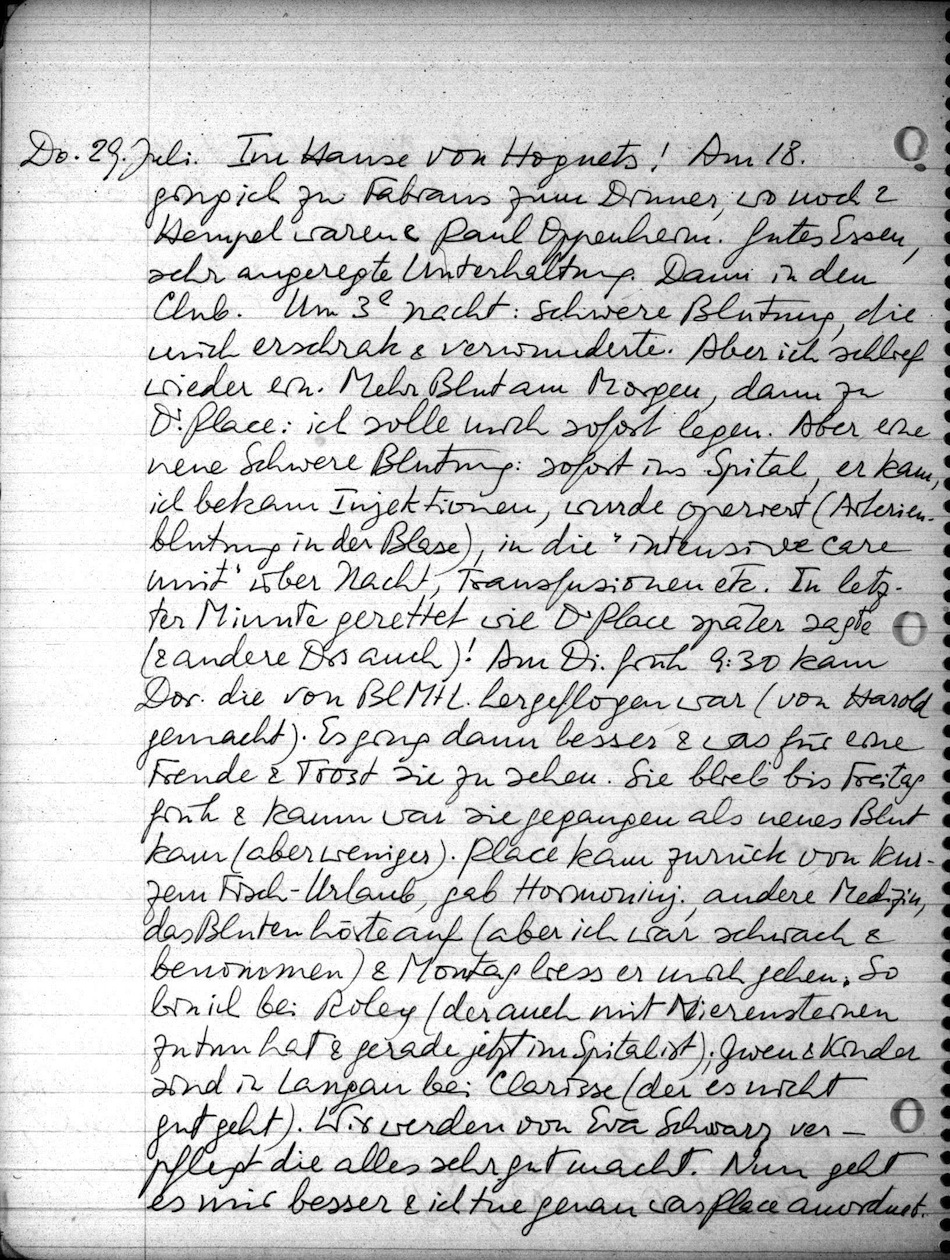 Im Hause von Hognets! Am 18. ging ich zu Fabians zum Dinner, wo noch 2 Hempel waren & Paul Oppenheim. Gutes Essen, sehr angeregte Unterhaltung. Dann in den Club. Um 3h nacht: schwere Blutung, die mich erschrak & verwunderte. Aber ich schlief wieder ein. Mehr Blut am Morgen, dann zu Dr Place: ich solle mich sofort legen. Aber eine neue schwere Blutung: sofort ins Spital, er kam, ich bekam Injektionen, wurde operiert (Arterienblutung in der Blase), in die "intensive care unit" über Nacht, Transfusionen etc. In letzter Minute gerettet wie Dr Place später sagte (& andere Drs auch)! Am Di. früh 9:30 kam Dor. die von Bl Mt. L. hergeflogen war (von Harold gemacht). Es ging dann besser & was für eine Freude & Trost sie zu sehen. Sie blieb bis Freitag früh & kaum war sie gegangen als neues Blut kam (aber weniger). Place kam zurück von kurzem Fisch-Urlaub, gab Hormoninj., andere Medizin, das Bluten hörte auf (aber ich war schwach & benommen) & Montag liess er mich gehen. So bin ich bei Roley (der auch mit Nierensteinen zu tun hat & gerade jetzt im Spital ist); Gwen & Kinder sind in Langau bei Clarisse (der es nicht gut geht). Wir werden von Eva Schwarz verpflegt die alles sehr gut macht. Nun geht es mir besser & ich tue genau was Place anordnet.