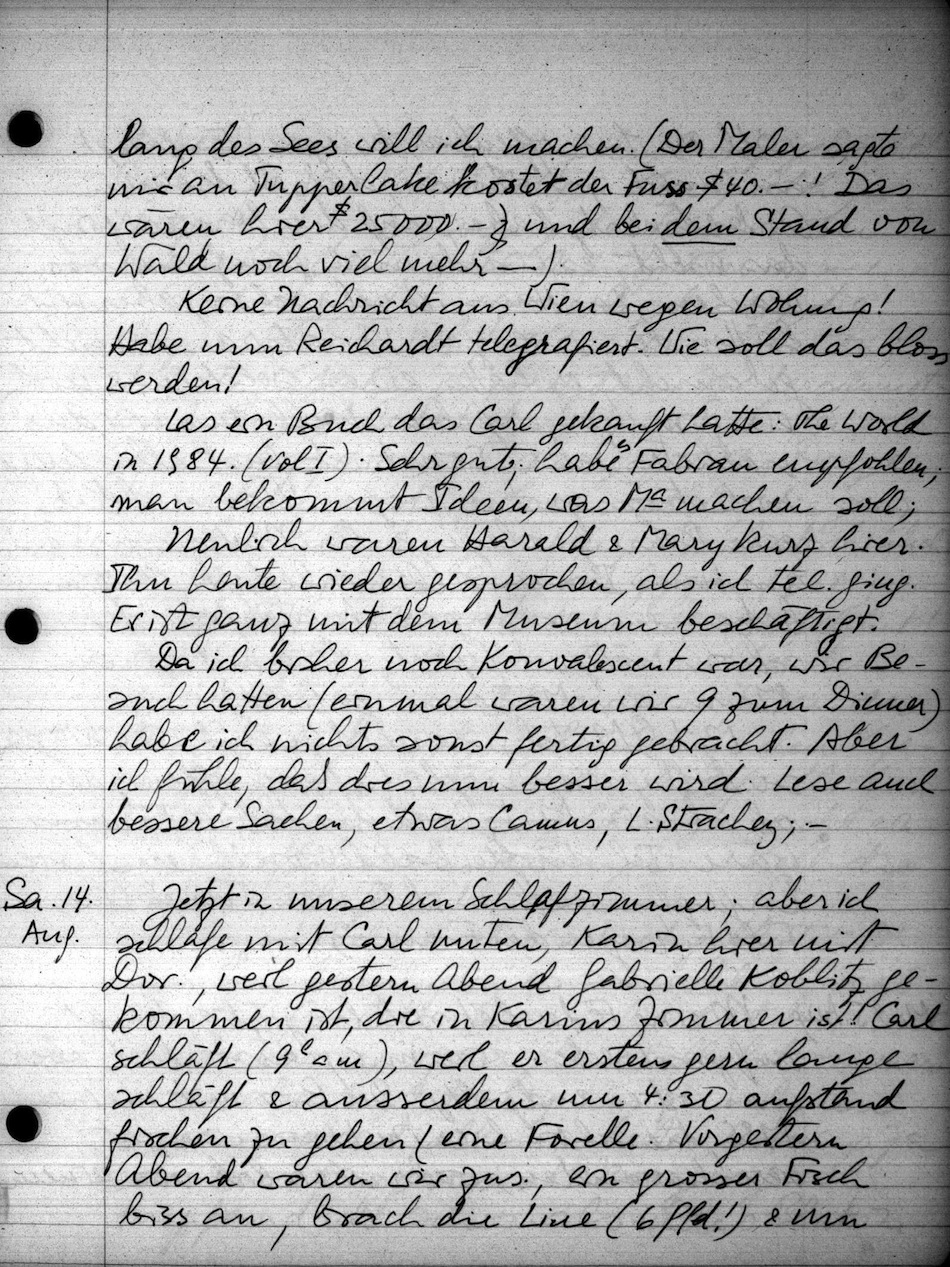Jetzt in unserem Schlafzimmer; aber ich schlafe mit Carl unten, Karin hier mit Dor., weil gestern Abend Gabrielle Koblitz gekommen ist, die in Karins Zimmer ist! Carl schläft (9h a.m.), weil er erstens gern lange schläft & ausserdem um 4:30 aufstand fischen zu gehen (eine Forelle). Vorgestern Abend waren wir zus. ein grosser Fisch biss an, brach die Line (6 Pfd!) & nun will er ihn offenbar kriegen). Es fängt an mich zu stören, daß ich keinen Arbeitsplatz habe; auf die Dauer ginge das nicht, es würde mich ganz nervös machen. Das Haus ist sehr schön, aber wir hätten den riesigen Vorratsraum nicht gebraucht; er hätte einen solchen & noch ein Zimmer ergeben. Viell. tun wir das nächstes Jahr. Sonst ist fast alles fertig, noch etwas zu tun wegen Wasserabschluß, eine Röhre zu legen & der Maler aussen am Haus. Innen alles erledigt. Gestern bekamen wir sogar das Telefon, das schon nötig ist (Party-line mit einem Mann am Museum geteilt).