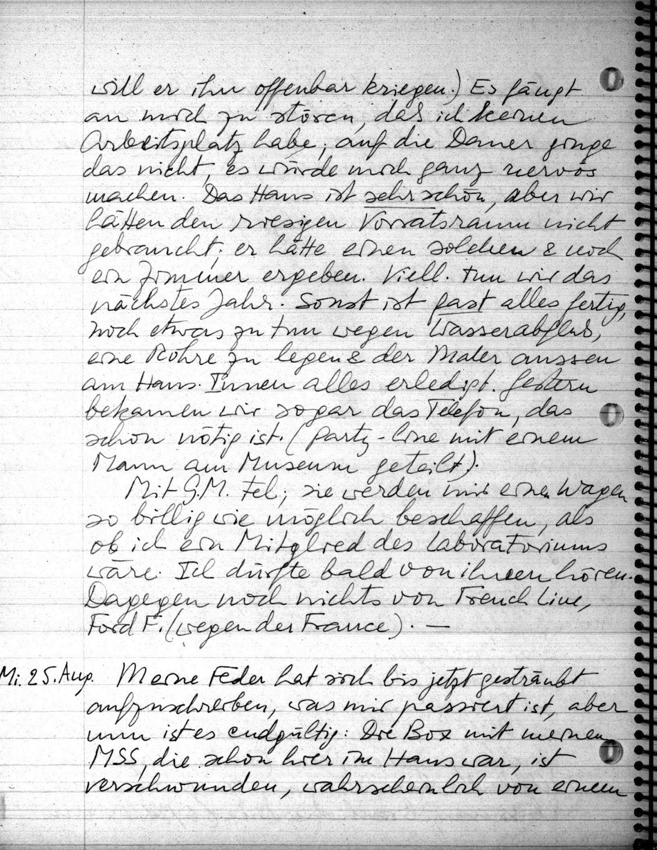 Meine Feder hat sich bis jetzt gesträubt aufzuschreiben, was mir passiert ist, aber nun ist es endgültig: Die Box mit meinen MSS, die schon hier im Haus war, ist verschwunden, wahrscheinlich von einem Arbeiter aus Versehen auf den Dump gebracht! Darin: Meine Vorles. Notizen über Spielth., Nutzenth., ; Der Anfang des Buches über Basic Conc. of G Th.; Der Aufsatz über n, n-1 G (noch auf Johnny zurückgehend!), die Mappe über De Viti; über "Anuihilation"; etc. etc. Etliches unersetzbar. Niederschmetternd. So viel Arbeit darin, so viele neue Ideen skizziert & z.T. ausgeführt. Dinge die ich hier weiterführen wollte, die ganz nahe der Vollendung waren. Es ist abscheulich.