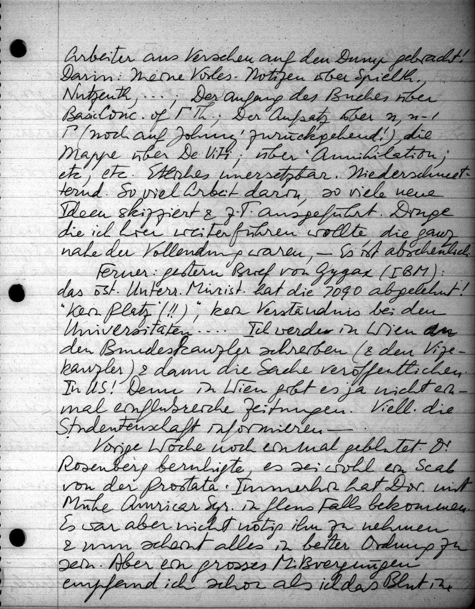 Ferner: gestern Brief von Gygax (IBM): das öst. Unterr. Minist. hat die 7090 abgelehnt! "Kein Platz(!!)", kein Verständnis bei den Universitäten Ich werde in Wien an den Bundeskanzler schreiben (& dem Vizekanzler) & dann die Sache veröffentlichen. In US! Denn in Wien gibt es ja nicht einmal einflußreiche Zeitungen. Viell. die Studentenschaft informieren.