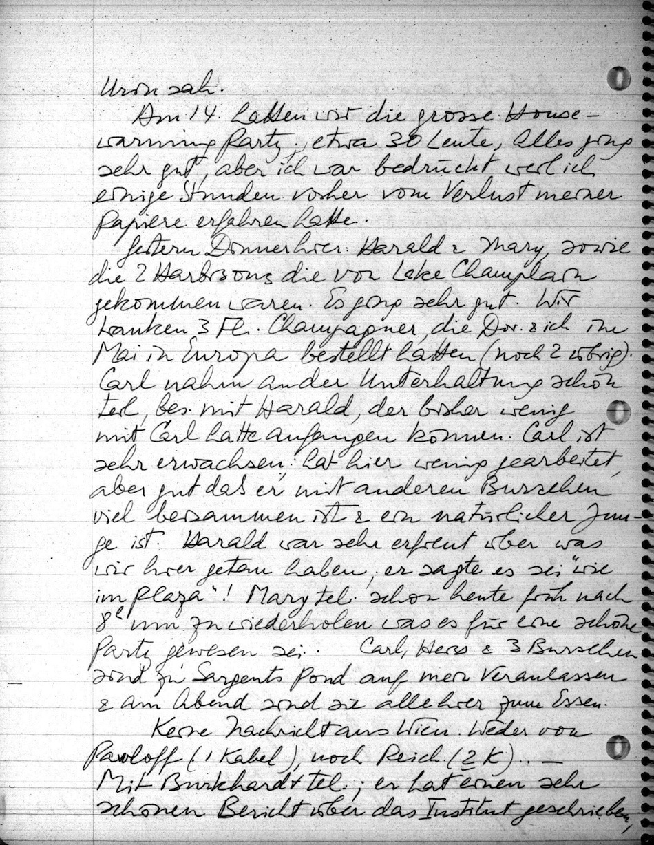 Gestern Dinner hier: Harald & Mary, sowie die 2 Harbisons die von Lake Champlain gekommen waren. Es ging sehr gut. Wir tranken 3 Fl. Champagner, die Dor. & ich im Mai in Europa bestellen hatten (noch 2 übrig). Carl nahm an der Unterhaltung schön teil, bes. mit Harald, der bisher wenig mit Carl hatte anfangen können. Carl ist sehr erwachsen; hat hier wenig gearbeitet, aber gut daß er mit anderen Burschen viel beisammen ist & ein natürlicher Junge ist. Harald war sehr erfreut über was wir hier getan haben; er sagte es sei "wie im Plaza"! Mary tel. schon heute früh nach 8h um zu wiederholen, was es für eine schöne Party gewesen sei. Carl, Heiss & 3 Burschen sind zu Sargents Pond auf mein Veranlassen & am Abend sind sie alle hier zum Essen.
