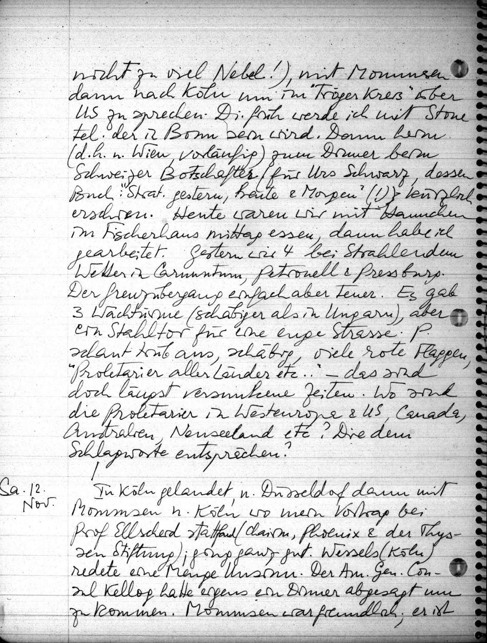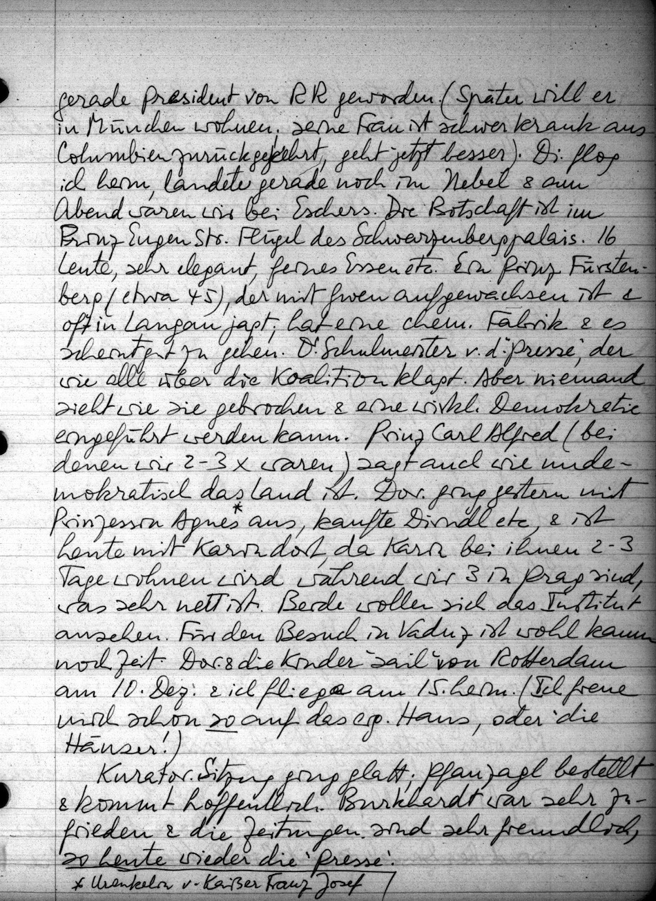 In Köln gelandet, n. Düsseldorf, dann mit Mommsen n. Köln wo mein Vortrag bei Prof. Ellscheid stattfand (Chairm. Phoenix & der Thyssen Stiftung); ging ganz gut. Wessels (Köln) redete eine Menge Unsinn. Der Am. Gen. Consul Kellog hatte eigens ein Dinner abgesagt um zu kommen. Mommsen war freundlich; er ist gerade Präsident von RR geworden. (Später will er in München wohnen; seine Frau ist schwer krank aus Columbien zurückgekehrt, geht jetzt besser.) Di. flog ich heim, landete gerade noch im Nebel & am Abend waren wir bei Eschers. Die Botschaft ist im Prinz Eugen Str. Flügel des Schwarzenbergpalais. 16 Leute, sehr elegant, feines Essen etc. Ein Prinz Fürstenberg (etwa 45), der mit Gwen aufgewachsen ist & oft in Langau jagt; hat eine chem. Fabrik & es scheint gut zu gehen. Dr Schulmeister v.d. "Presse", der wie alle über die Koalition klagt. Aber niemand sieht wie sie gebrochen & eine wirkl. Demokratie eingeführt werden kann. Prinz Carl Alfred (bei denen wir 2-3 x waren), sagt auch wie undemokratisch das Land ist. Dor. ging gestern mit Prinzessin Agnes? aus, kaufte Dirndl etc., & ist heute mit Karin dort, da Karin bei ihnen 2-3 Tagen wohnen wird während wir 3 in Prag sind, was sehr nett ist. Beide wollen sich das Institut ansehen. Für den Besuch in Vaduz ist wohl kaum noch Zeit. Dor. & die Kinder "sail" von Rotterdam am 10. Dez., & ich fliege am 15. heim. (Ich freue mich schon so auf das eig. Haus, oder die Häuser!)