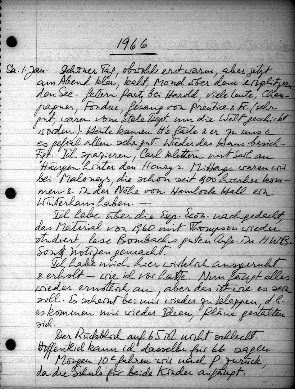 Schöner Tag, obwohl erst warm, aber jetzt am Abend klar, kalt, Mond über dem eisglitzernden See. Gestern Party bei Harold, viele Leute, Champagner, Fondue, Gesang von Prentice & Fr. (sehr gut, waren vom State Dept. um die Welt geschickt worden). Heute kamen H's Gäste & er zu uns & es gefiel allen sehr gut. Wieder das Haus besichtigt. Ich spazieren, Carl klettern mit Seil an Hängen hinter den Henrys. Mittags waren wir bei Maloneys, die schon seit 1900 hierher kommen & in der Nähe von Hemlock Hall ein Winterhaus haben.