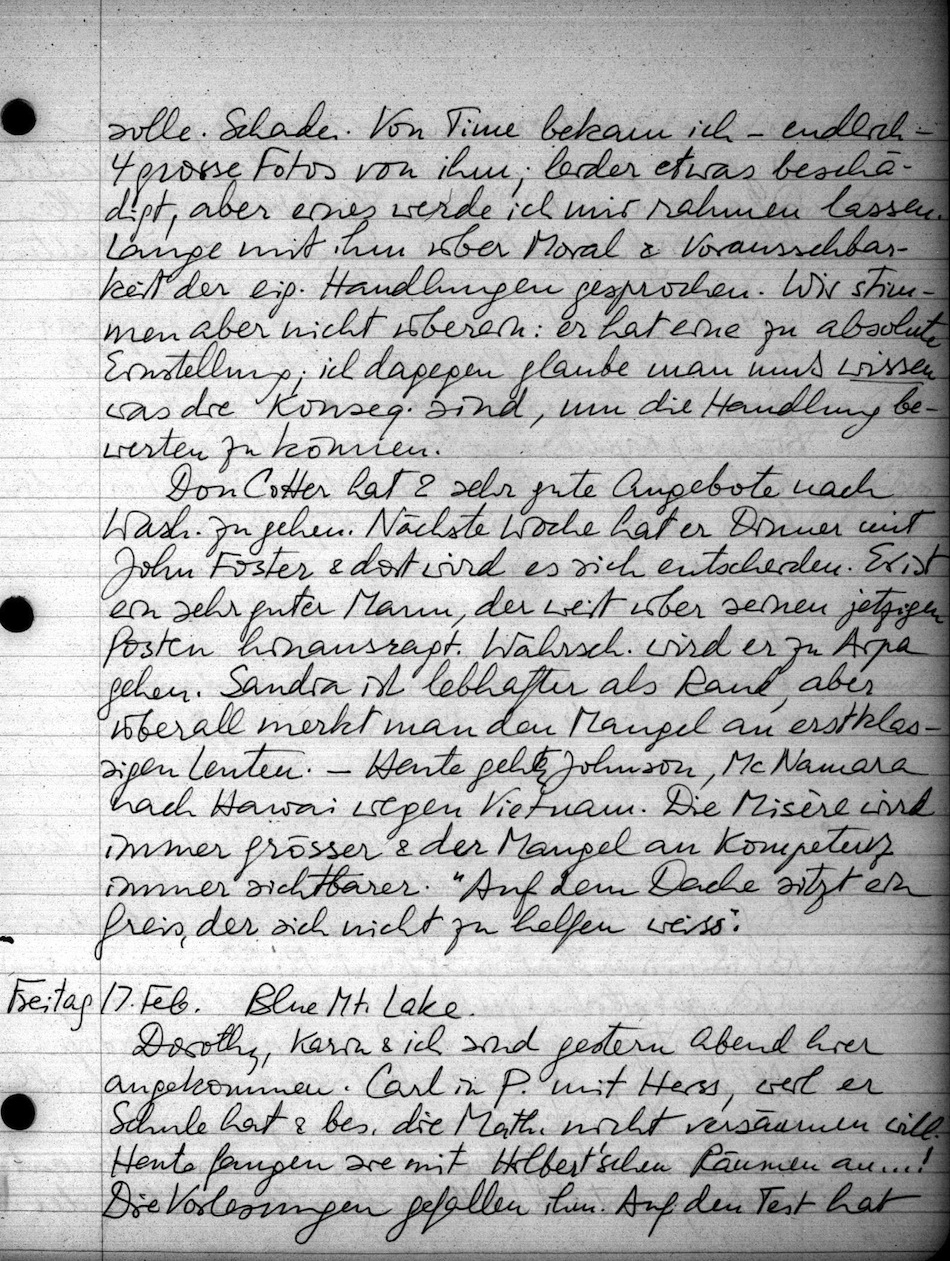 Con Cotter hat 2 sehr gute Angebote nach Wash. zu gehen. Nächste Woche hat er Dinner mit John Foster & dort wird es sich entscheiden. Er ist ein sehr guter Mann, der weit über seinen jetzigen Posten hinausragt. Wahrsch. wird er zu Arpa gehen. Sandia ist lebhafter als Rand, aber überall merkt man den Mangel an erstklassigen Leuten. Heute gehen Johnson, McNamara nach Hawai wegen Vietnam. Die Misère wird immer grösser & der Mangel an Kompetenz immer sichtbarer. "Auf dem Dache sitzt ein Greis, der sich nicht zu helfen weiss".