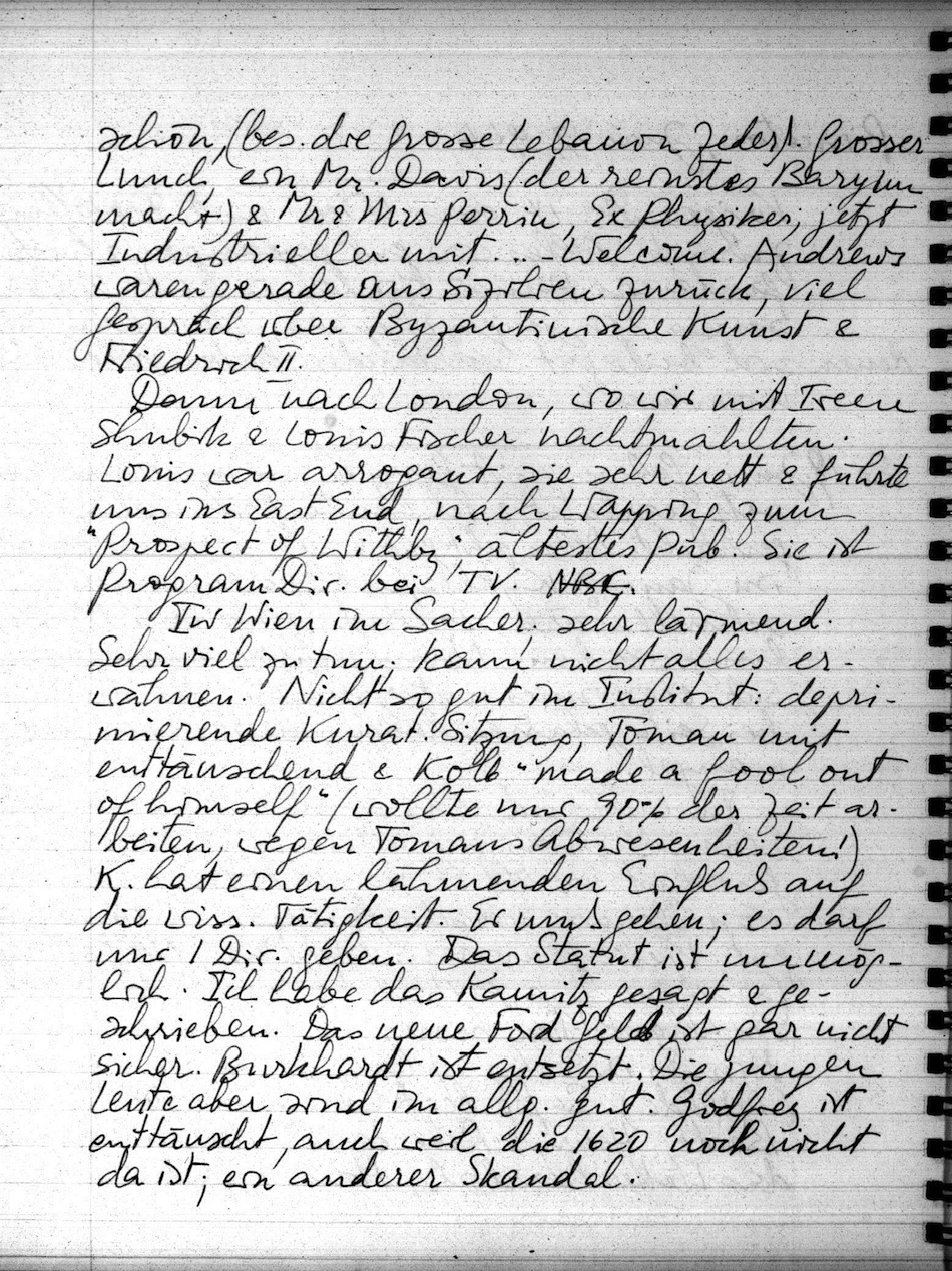 In Wien im Sacher; sehr lärmend. Sehr viel zu tun; kann nicht alles erwähnen. Nicht so gut im Institut: deprimierende Kurat.Sitzung, Toman mit enttäuschend & Kolb "made a fool out of himhelf" (wollte nur 90% der Zeit arbeiten, wegen Tomans Abwesenheiten!) K. hat einen lähmenden Einfluß auf die wiss. Tätigkeit. Er muß gehen; es darf nur 1 Dir. geben. Das Statut ist unmöglich. Ich habe das Kamitz gesagt & geschrieben. Das neue Ford Geld ist gar nicht sicher. Burkhardt ist entsetzt. Die jungen Leute aber sind im allg. gut. Godfrey ist enttäuscht, auch weil die 1620 noch nicht da ist; ein anderer Skandal.