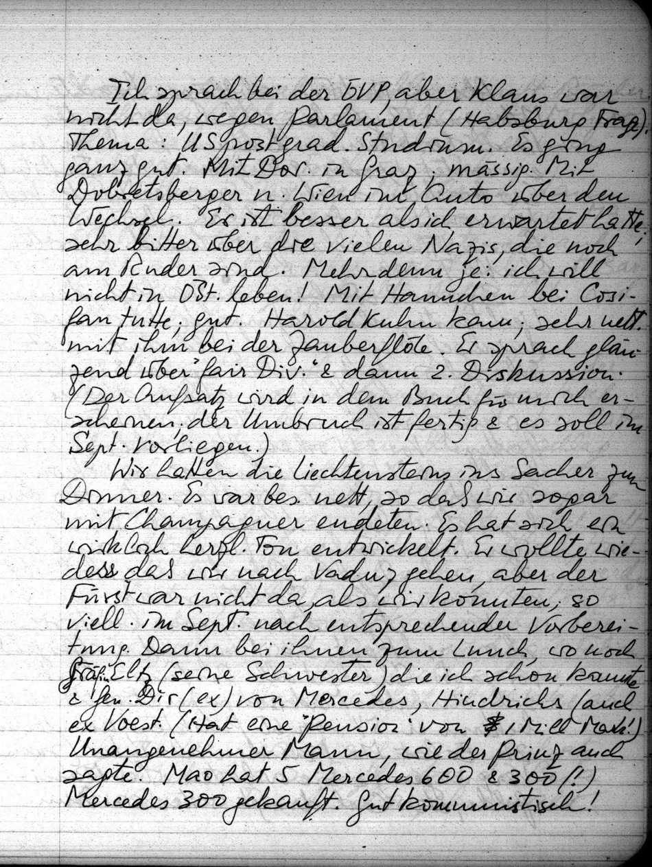Wir hatten die Liechtensteins ins Sacher zum Dinner. Es war bes. nett, so daß wir sogar mit Champagner endeten. Es hat sich ein wirklich herzl. Ton entwickelt. Er wollte wieder daß wir nach Vaduz gehen, aber der Fürst war nicht da, als wir konnten; so viell. im Sept. nach entsprechender Vorbereitung. Dann bei ihnen zum Lunch, wo noch Gräfin Eltz (seine Schwester) die ich schon kannte & Gen. Dir (ex) von Mercedes, Hindrichs (auch ex Voest. (Hat eine "Pension" von 1 Mill Mark!) Unangenehmer Mann, wie der Prinz auch sagte. Mao hat 5 Mercedes 600 & 300 (!) Mercedes 300 gekauft. Gut kommunistisch!