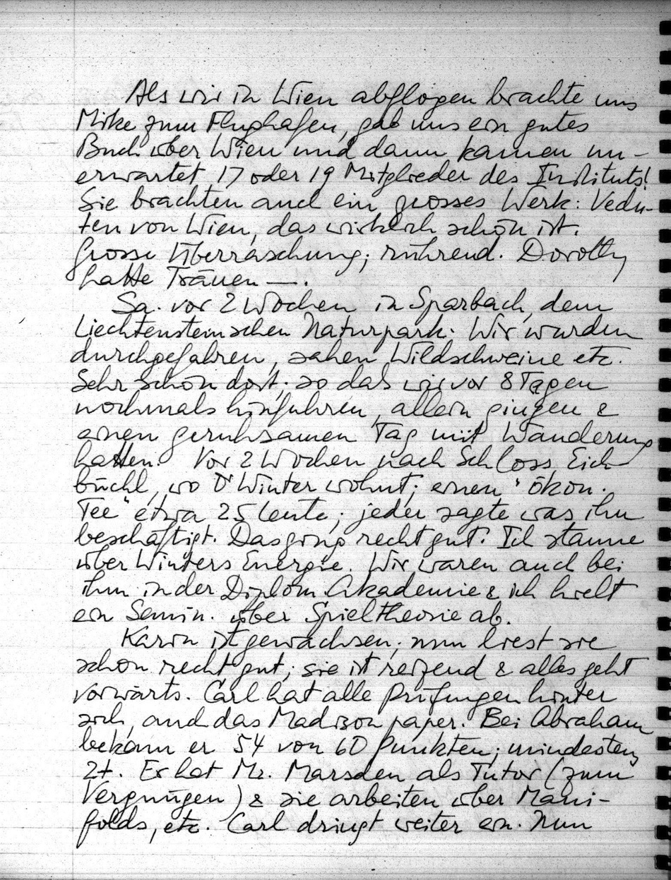 Sa. vor 2 Wochen in Sparbach, dem Liechtensteinschen Naturpark. Wir wurden durchgefahren, sahen Wildschweine etc. Sehr schön dort; so daß wir vor 8 Tagen nochmals hinfuhren, allein gingen & einen geruhsamen Tag mit Wanderung hatten. Vor 2 Wochen nach Schloss Eichbüchl, wo Dr Winter wohnt; einen "ökon. Tee" etwa 25 Leute; jeder sagte was ihn beschäftigt. Das ging recht gut. Ich staune über Winters Energie. Wir waren auch bei ihm in der Diplom Akademie & ich hielt ein Semin. über Spieltheorie ab.