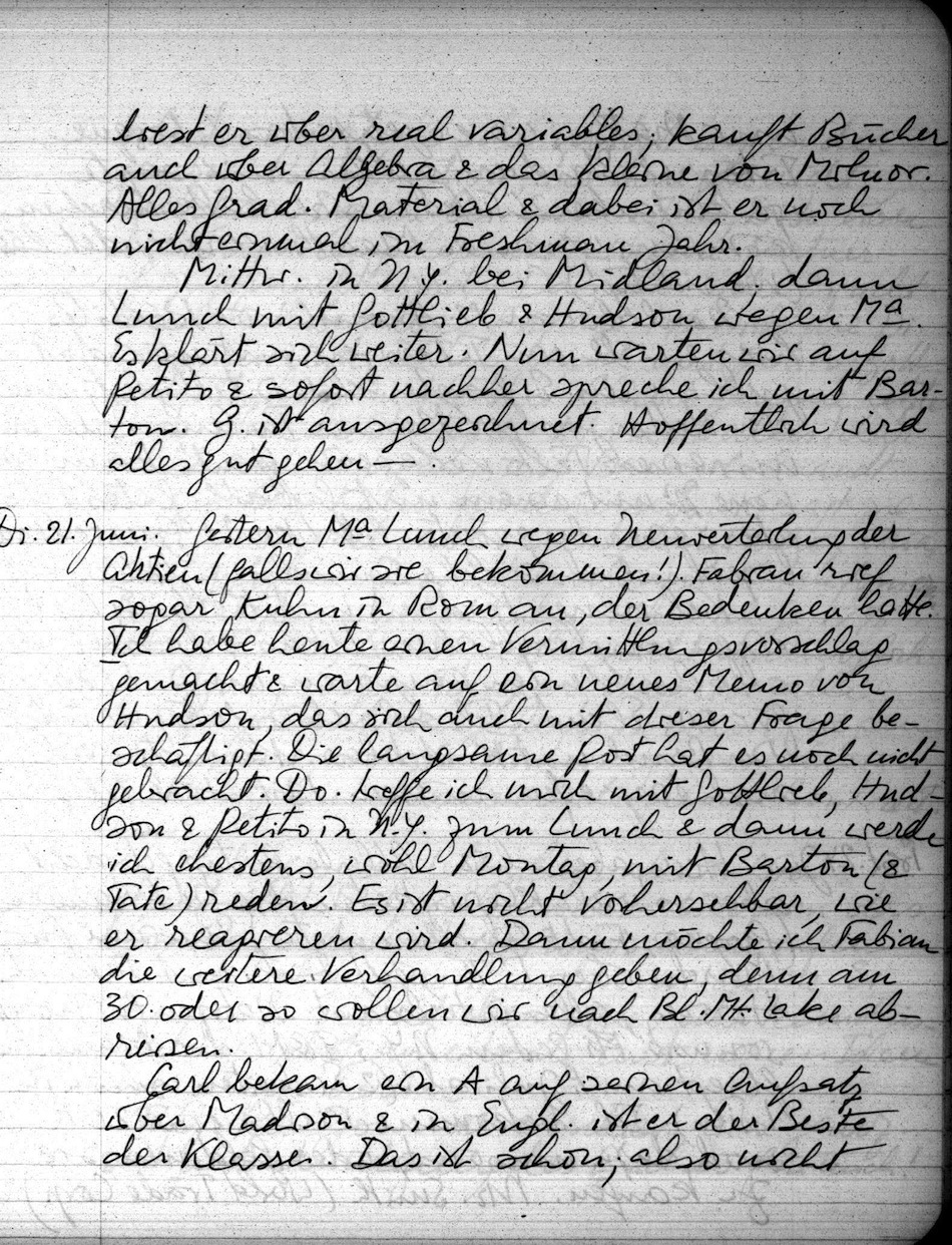 Gestern Ma Lunch wegen Neuverteilung der Aktien (falls wir sie bekommen!). Fabian rief sogar Kuhn in Rom an, der Bedenken hatte. Ich habe heute einen Vermittlungsvorschlag gemacht & warte auf ein neues Memo von Hudson, das sich auch mit dieser Frage beschäftigt. Die langsame Post hat es noch nicht gebracht. Do. treffe ich mich mit Gottlieb, Hudson & Petito in N.Y. zum Lunch & dann werde ich ehestens, wohl Montag, mit Barton (& Tate) reden. Es ist nicht vorhersehbar, wie er reagieren wird. Dann möchte ich Fabian die weitere Verhandlung geben, denn am 30. oder so wollen wir nach Bl. Mt. Lake abreisen.