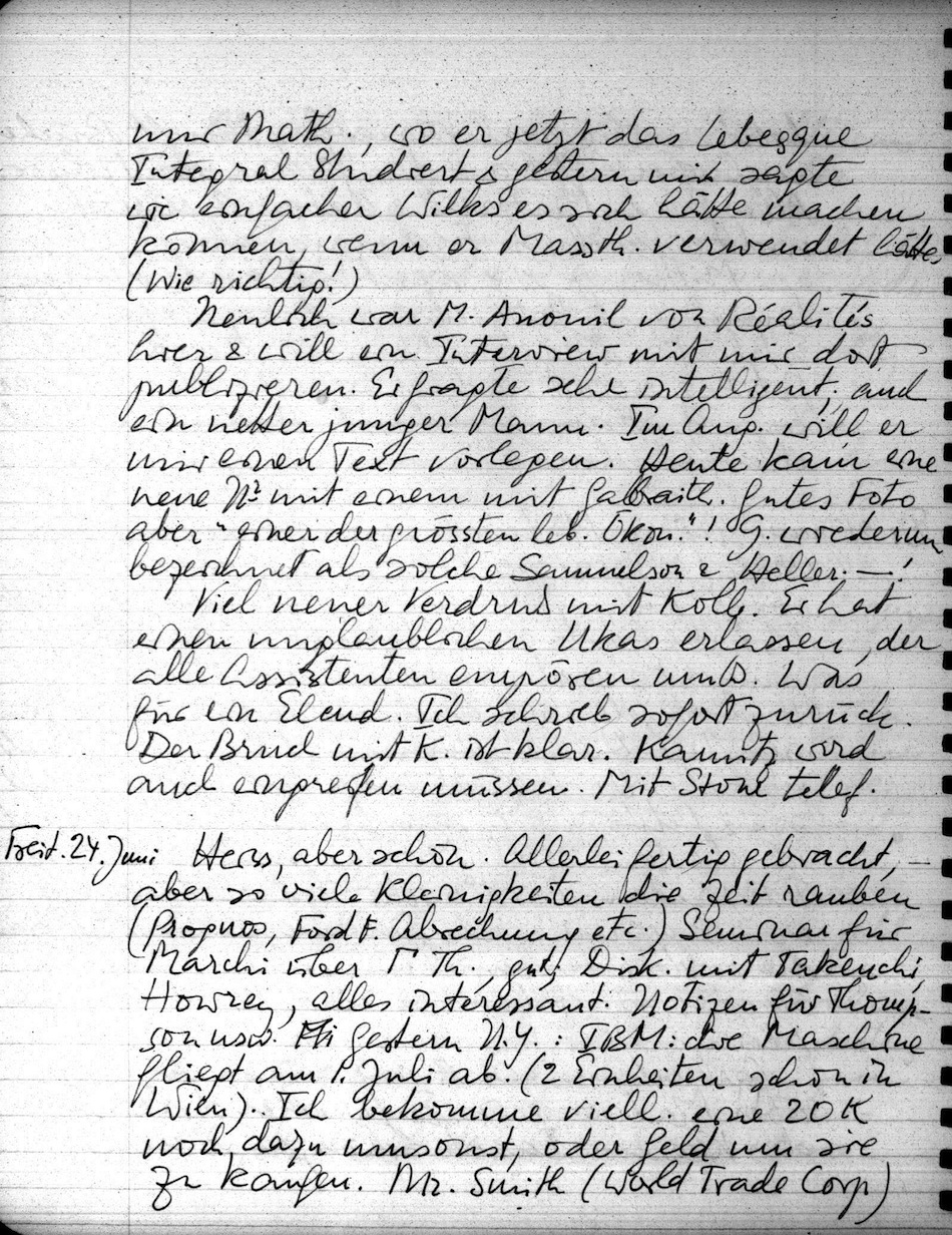 Viel neuer Verdruß mit Kolb. Er hat einen unglaublichen Ukas erlassen, der alle Assistenten empören muß. Was für ein Elend. Ich schrieb sofort zurück. Der Bruch mit K. ist klar. Kamitz wird auch eingreifen müssen. Mit Stone telef.