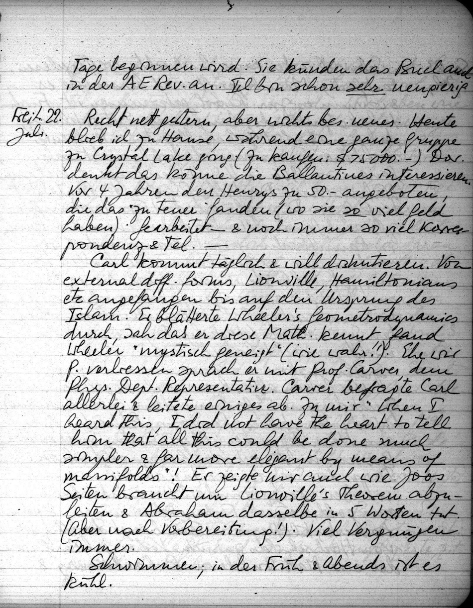 Carl kommt täglich & will diskutieren. Von externaldiff. forms, Lionville, Hamiltonians etc. angefangen bis auf den Ursprung des Islam. Er blätterte Wheeler's Geometrodynamics durch, sah daß er diese Math. kennt, fand Wheeler "mystisch geneigt" (wie wahr!!). Ehe wir P. verliessen sprach er mit Prof. Carver, dem Phys. Dept. Representatin. Carver befragte Carl allerlei & leitete einiges ab. Zu mir "When I heard this, I did not have the heart to tell him that all this could be done much simpler & far more elegant by means of manifolds"! Er zeigte mir auch wie Joos Seiten braucht um Leonville's Theorem abzuleiten & Abraham dasselbe in 5 Worten tut (Aber nach Vorbereitung!). Viel Vergnügen immer.