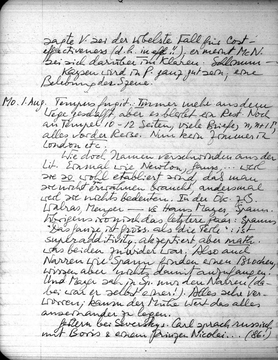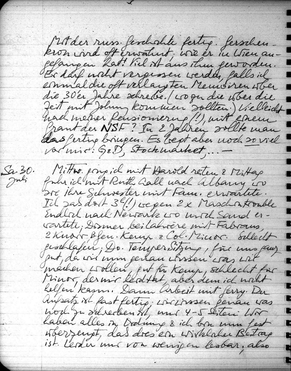 Mittw. ging ich mit Harold reiten & Mittag fuhr ich mit Ruth Aall nach Albany wo sie ihre Schwester mit Fam. erwartete. Ich saß dort 3h(!) wegen 2 x Maschintrouble. Endlich nach Newark wo mich Sand erwartete; Dinner bei Lahiére mit Fabians, 2 Knorr, B. Gen. Kemp & Col. Minor. Schlecht geschlafen; Do. Temper Sitzung, für uns ganz gut, da wir nun genau wissen was wir machen wollen, gut für Kemp, schlecht für Minor, der mir leidtat, aber dem ich nicht helfen kann. Dann Arbeit mit Gerry. Der Aufsatz ist fast fertig; wir wissen genau was noch zu schreiben ist, nur 4-5 Seiten. Wir haben alles in Ordnung & ich bin nun fest überzeugt, daß dies ein wirklicher Beitrag ist. Leider nur von wenigen Lesbar; also sollte man über ihn (& KMT) einen verbalen Kommentar schreiben; aber dazu keine Zeit. Jedoch allmählich wird die Sache bekannt werden. Abends bei Hognets z. Dinner; & im Office alles in Ordnung gebracht. Freitag mit Fabian zur MRCA Board Sitzung. Es geht dort viel besser. Nichts über die Ma Angelegenheit aber ich drängte Sam & Tate mir noch vor der Abreise zu schreiben. Vor Mitte Sept. wird nichts wirkl. passieren; Sam hofft anscheinend daß Kuhn nicht unserer Meinung ist!