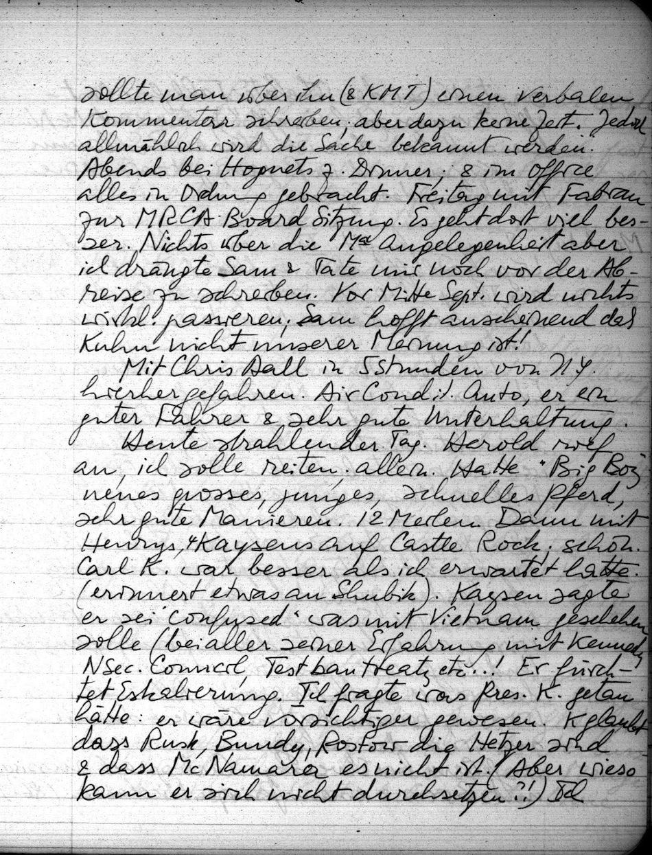 Heute strahlender Tag. Harold rief an, ich solle reiten; allein. Hatte "Big Boy" neues grosses, junges, schnelles Pferd, sehr gute Manieren. 12 Meilen. Dann mit Henrys, 4 Kaysens auf Castle Rock; schön. Carl K. war besser als ich erwartet hatte. (erinnert etwas an Shubik). Kaysen sagte er sei "confused" was mit Vietnam geschehen solle (bei aller seiner Erfahrung mit Kennedy NSec. Council, Testbau treaty etc ! Er fürchtet Eskalierung. Ich fragte was Pres. K. getan hätte: er wäre vorsichtiger gewesen. K. glaubt dass Rusk, Bundy, Rostow die Hetzer sind & dass McNamara es nicht ist. (Aber wieso kann er sich nicht durchsetzen?!) Ich sagte V. sei der übelste Fall für Cost-evectiveness (d.h. in eff!!); er meint McN. sei sich darüber im Klaren. Schlimm