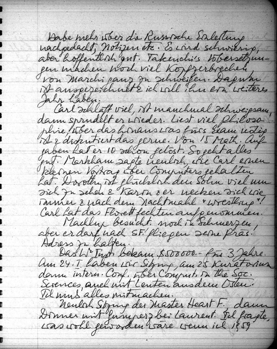 Carl schläft viel, ist manchmal schweigsam, dann sprudelt er wieder. Liest viel Philosophie, über das hinaus was fürs Exam nötig ist & diskutiert das gerne. Von 15 Math. Aufgaben hat er 10 schon gelöst. So geht alles gut. Markham sagte neulich, wie Carl einen kleinen Vortrag über Computers gehalten hat. Dorothy ist glücklich den Sohn viel um sich zu sehen & Karin & er necken sich wie immer & nach dem Nachtmahl "wresthing"! Carl hat das Florettfechten aufgenommen.