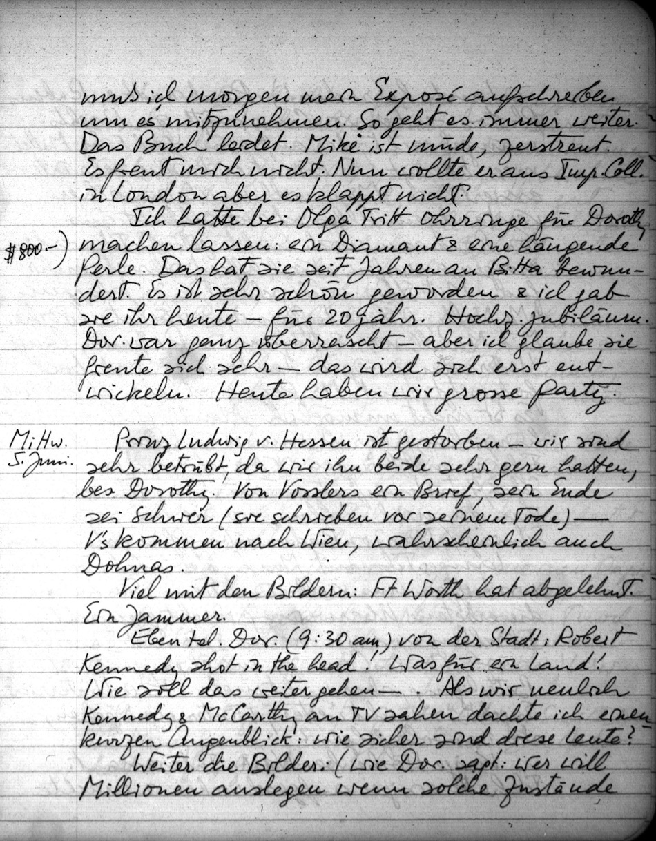 Eben tel. Dor. (9:30 am) von der Stadt: Robert Kennedy shot in the head! Was für ein Land! Wie soll das weiter gehen . Als wir neulich Kennedy & McCarthy im TV sahen dachte ich einen Augenblick: wie sicher sind diese Leute?