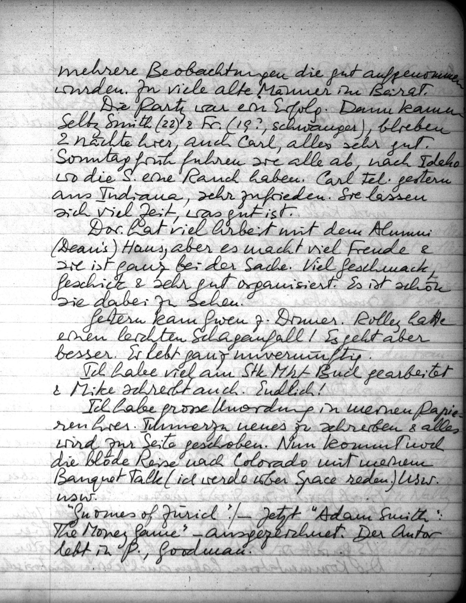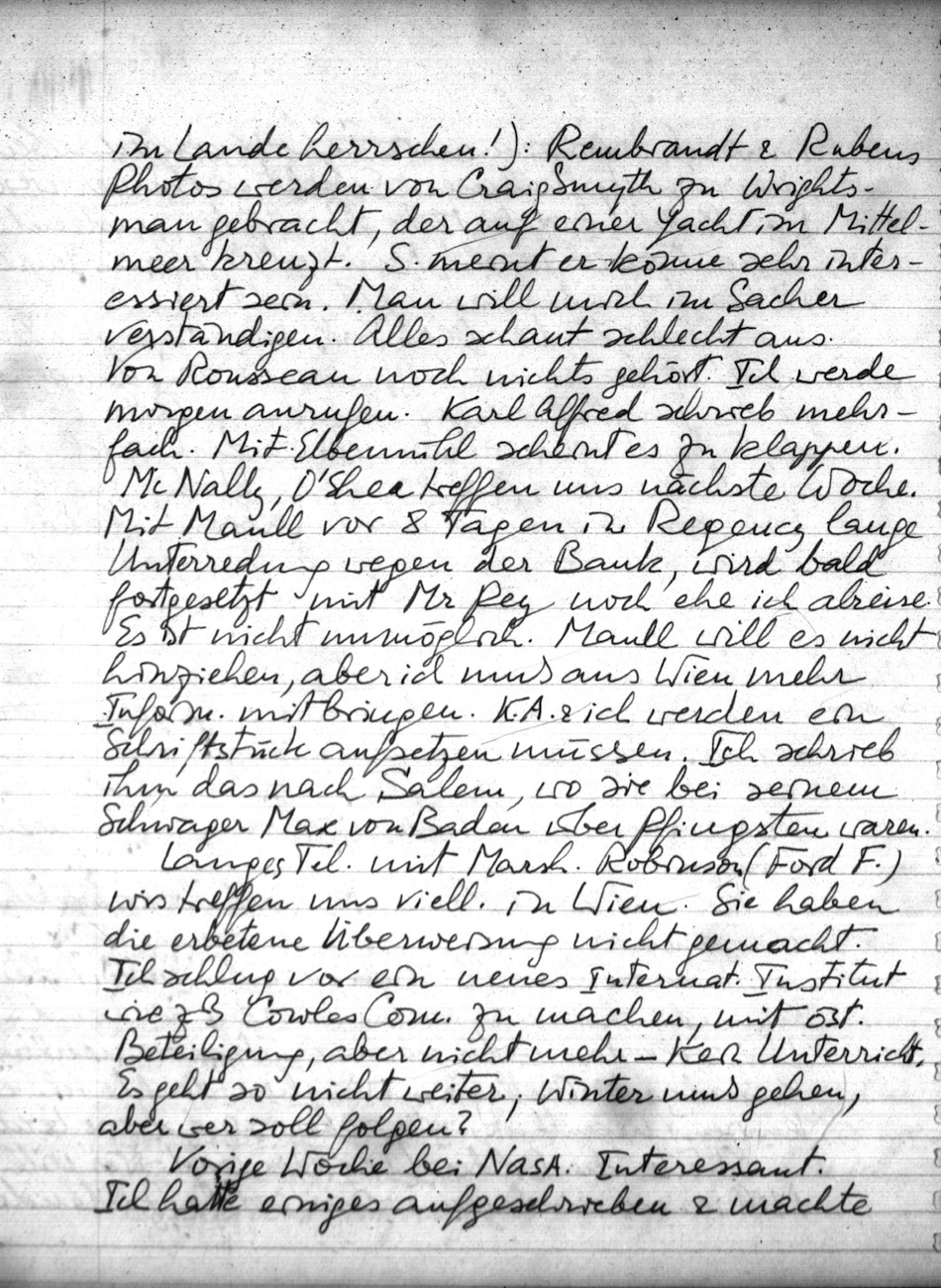 Langes Tel. mit Marsh. Robinson (Ford F.) wir treffen uns viell. in Wien. Sie haben die erbetene Überweisung nicht gemacht. Ich schlug vor ein neues internat. Institut wie z.B. Cowles Com. zu machen, mit öst. Beteiligung, aber nicht mehr kein Unterricht. Es geht so nicht weiter; Winter muß gehen, aber wer soll folgen?