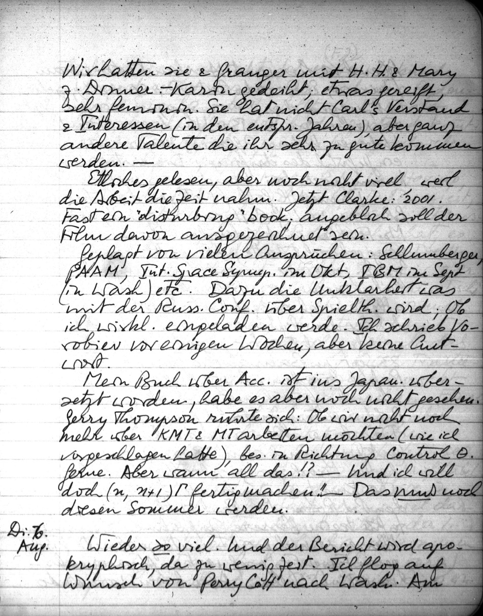 Wieder so viel. Und der Bericht wird apokryphisch, da zu wenig Zeit. Ich flog auf Wunsch von Perry Cott nach Wash. Am Abend vorher mit Harlan Mills & Frau (Luxus, El Dorado Auto ~ 9000,-!), sehr nett, wegen des IBM Sympos. wo ich Sept. 4 sprechen muß. Bei Henderson (Rand); sie studieren Urban Affairs; Neuorientierung & ein Gefühl des "drifting". Die ersten Leute sind kaum noch bei Rand.