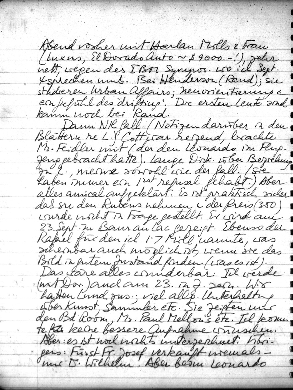 Dann Ntl Gall. (Notizen darüber in den Blättern re L.) Cott war reizend, brachte Mr. Feidler mit (der den Leonardo im Flugzeug gebracht hatte). Lange Disk. über Beziehung zu L., meine sowohl wie der Gall. (Sie haben immer ein 1rst refusal gehabt.) Aber alles amical aufgeklärt. Es ist praktisch sicher daß sie den Rubens nehmen & der Preis (350) wurde nicht in Frage gestellt. Er wird am 23. Sept. im Baur an Lac gezeigt. Ebenso der Rafael für den ich 1.7 Mill nannte, was scheinbar auch möglich ist, wenn sie das Bild in gutem Zustand finden (was es ist). Das wäre alles wunderbar. Ich werde (mit Dor.) auch am 23. in Z. sein. Wir hatten Lunch zus.; viel allg. Unterhaltung über Kunst, Sammler etc. Sie zeigten mir den Bd Room, Mr. Paul Mellon's etc. Ich konnte keine bessere Aufnahme wünschen. Aber: es ist noch nichts unterzeichnet. Übrigens: Fürst Fr. Josef verkauft niemals nur Dr Wilhelm. Aber beim Leonardo haben Sie es erreicht, daß er (F.J.) eine Urkunde unterzeichnet hat, was sie wegen der histor. Bedeutung der Erwerbung des L. wollten. Es ist also sehr wahrscheinlich daß beides zustande kommt: Ich habe Karl Alfred wegen des Rub. geschrieben & wegen Rf. angedeutet.