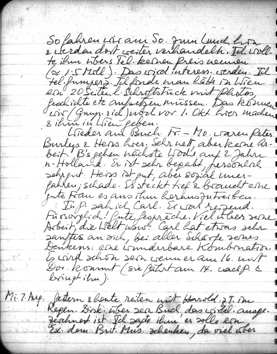 Wieder am Buch. Fr.-Mo. waren Peter Burleys & Heiss hier. Sehr nett, aber keine Arbeit. B's gehen nächste Woche auf 2 Jahre n. Holland. Er ist sehr begabt, persönlich sehr gut. Heiss ist gut, aber sozial unerfahren; schade. Es steckt tief & braucht eine gute Frau es aus ihm herauszutreiben.