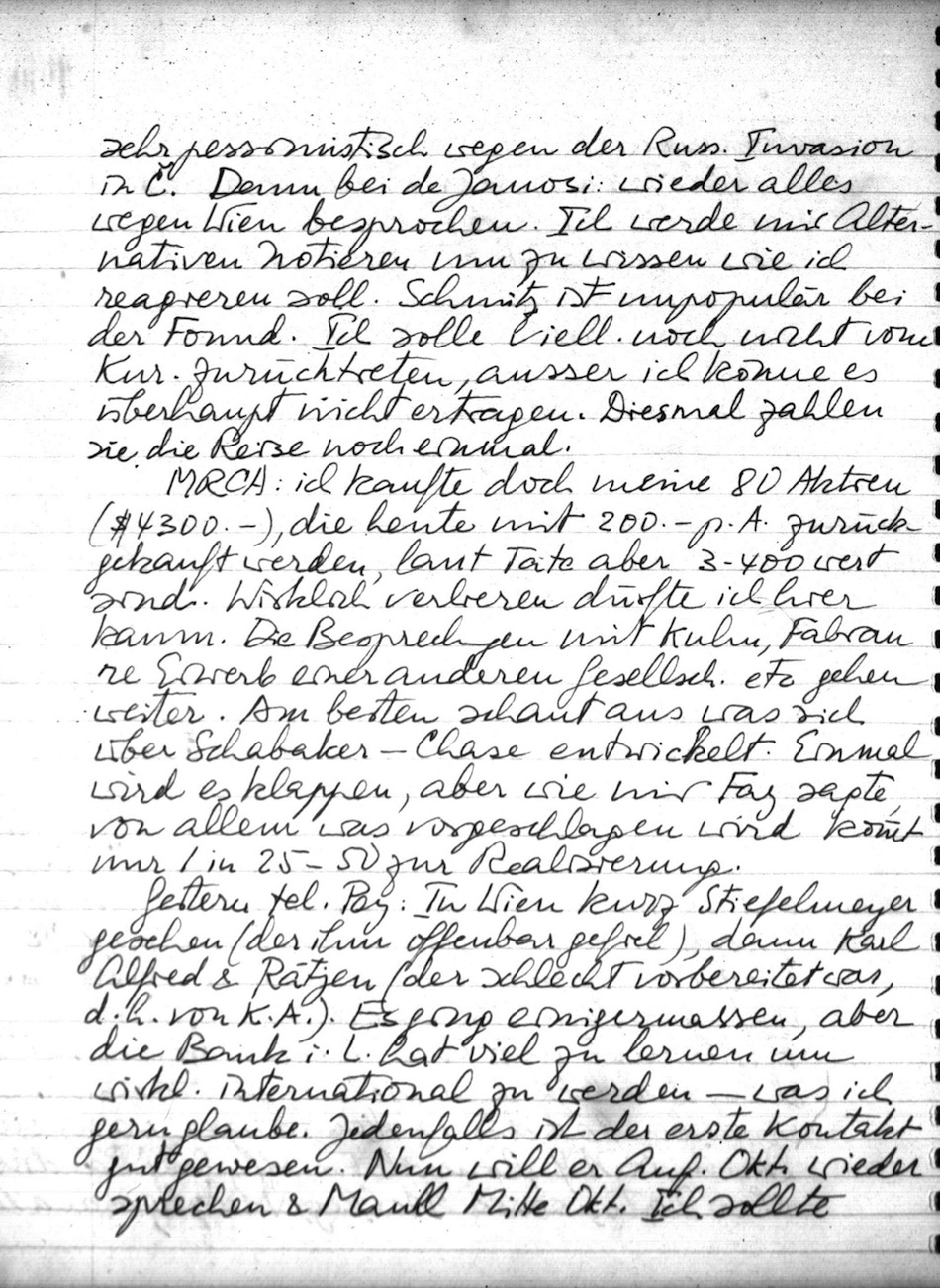 Gestern tel. Pey: In Wien kurz Stiefelmeyer gesehen (der ihm offenbar gefiel), dann Karl Alfred & Rätjen (der schlecht vorbereitet war, d.h. von K.A.). Es ging einigermassen, aber die Bank i. L. hat viel zu lernen um wirkl. international zu werden was ich gern glaube. Jedenfalls ist der erste Kontakt gut gewesen. Nun will er Anf. Okt. wieder sprechen & Maull Mitte Okt. Ich sollte beide Male dabei sein und werde das wohl so einrichten. Also es besteht Hoffnung; es hängt von der Vaduzer Einstellung ab. Midland möchte schon. Aber alles schwierig & unsicher. Pey sagte dass KA. mir schreibt. Pey & ich treffen uns am 17. d.M.