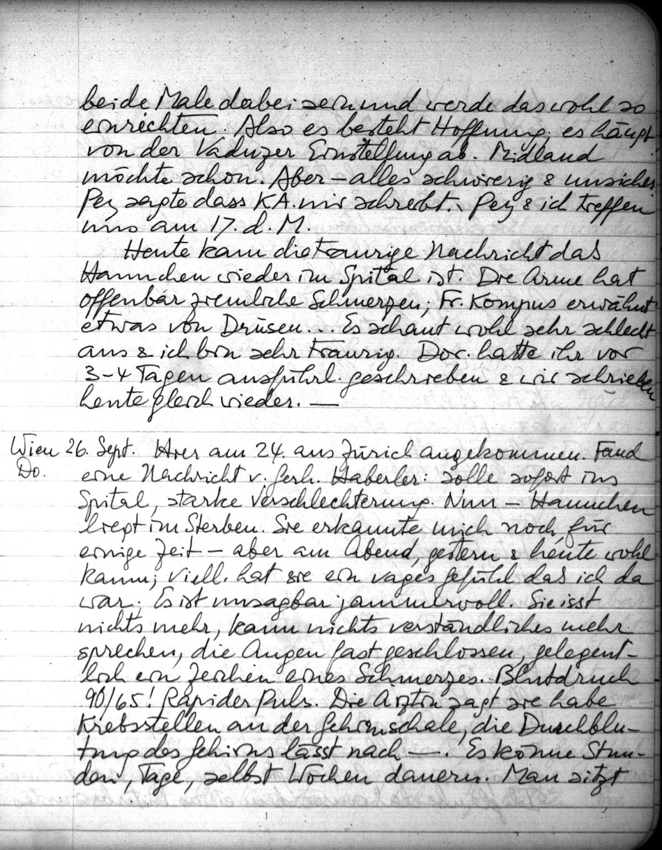 Heute kam die traurige Nachricht daß Hannchen wieder im Spital ist. Die Arme hat offenbar ziemliche Schmerzen; Fr. Kompus erwähnt etwas von Drüsen Es schaut wohl sehr schlecht aus & ich bin sehr traurig. Dor. hatte ihr vor 3-4 Tagen ausführl. geschrieben & wir schrieben heute gleich wieder.