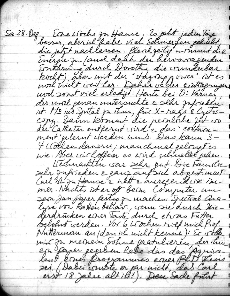 Weihnachten war sehr gut. Die Familie sehr zufrieden & ganz auf sich abgestimmt. Carl ist zu Hause & nett & anregend wie immer. Nachts ist er oft beim Computer um sein Jun. Paper fertig zu machen: Spectral Analyse von Ratten behav., wenn sie durch Niederdrücken einer Taste durch etwas Futter belohnt werden. Vor 6 Wochen rief mich Prof. Nutterman an (den ich nicht kenne): Er wolle mir zu meinem Sohne gratulieren, der ihm ein Paper gegeben habe das das Äquivalent eines Programmes einer PhD Theses sei. (Dabei wusste er gar nicht, daß Carl erst 18 Jahre alt ist!). Diese Sache führt Carl nun in erweiterter Form durch. 1972 publiziert in Science.