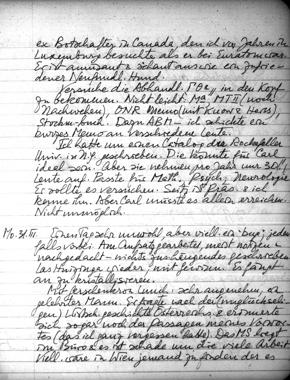 Mit Gerschenkron Lunch: sehr angenehm; ein gelehrter Mann. Er fragte nach der (unglückseligen) Wirtsch.geschichte Österreichs & er erinnerte sich sogar noch der Passagen meines Vorwortes (das ich ganz vergessen hatte). Das MS liegt im Büro & es ist schade um die viele Arbeit. Viell. wäre in Wien jemand zu finden der es fertig machte? Er hat vor einigen Jahren die Akten über Bohm-Bawerk als Fin. Min. durchgesehen. BB opponierte dem Kaiser als dieser mehr Geld für Militär wollte, da ihm seine Conversion wichtiger war (alle anderen Minister sehr zervil); und das wiederholt. Schliesslich bot er Demission an. Worauf Franz Jos.: "Es kommt nicht auf Min. Demissionen an, sondern darauf die beste Lösung zu finden." Überraschend.