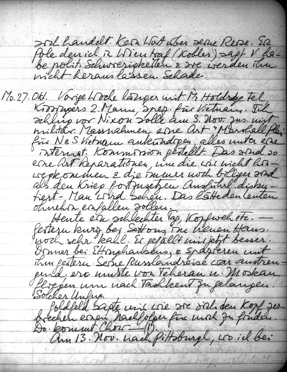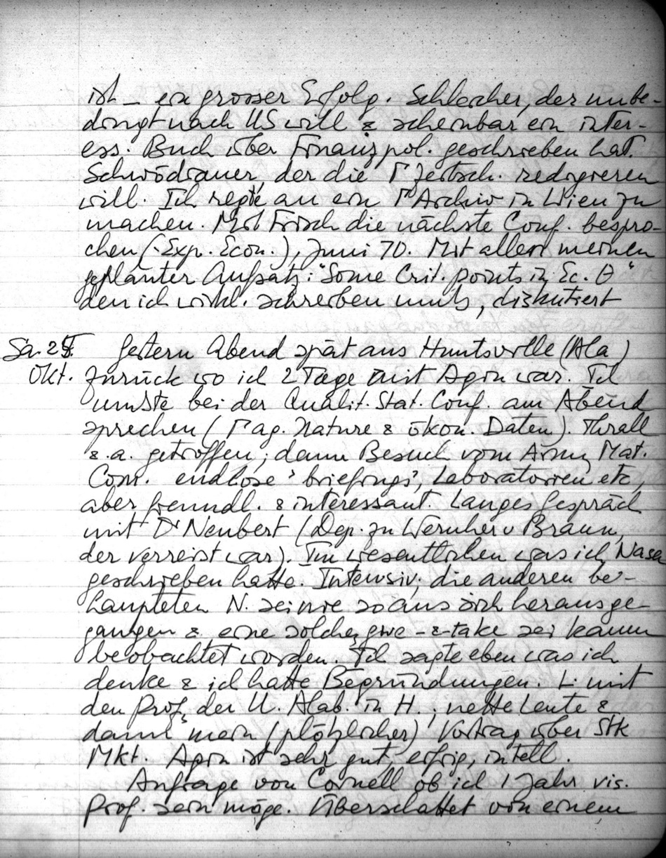 Gestern Abend spät aus Huntsville (Ala) zurück wo ich 2 Tage mit Agin war. Ich mußte bei der Qualit. Stat. Conf. am Abend sprechen (G ag. Nature & ökon. Daten). Thrall & a. getroffen; dann Besuch vom Army Mat. Com. endlose "briefings", Laboratorien etc, aber freundl. & interessant. Langes Gespräch mit Dr Neubert (Dep. zu Wernher v Braun, der verreist war). Im wesentlichen was ich Nasa geschrieben hatte. Intensiv; die anderen behaupteten N. sei nie so aus sich herausgegangen & eine solches gwe-&-take sei kaum beobachtet worden. Ich sagte eben was ich denke & ich hatte Begründungen. L. mit den Profs der U. Alab. in H.; nette Leute & dann mein (plötzlicher) Vortrag über Stk Mkt. Agin ist sehr gut, eifrig, intell.