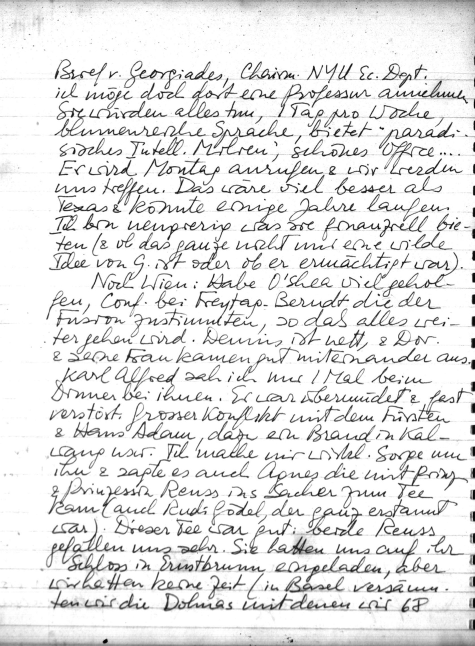 Anfrage von Cornell ob ich 1 Jahr vis. Prof. sein möge. Überschattet von einem Brief v. Georgiades, Chairm. NYU Ec. Dept. ich möge doch dort eine Professur annehmen. Sie würden alles tun, 1 Tag pro Woche, blumenreiche Sprache, bietet "paradisisches Intell. Milieu", schönes Office Er wird Montag anrufen & wir werden uns treffen. Das wäre bisl besser als Texas & könnte einige Jahre laufen. Ich bin neugierig was sie finanziell bieten (& ob das ganze nicht nur eine wilde Idee von G. ist oder ob er ermächtigt war).
