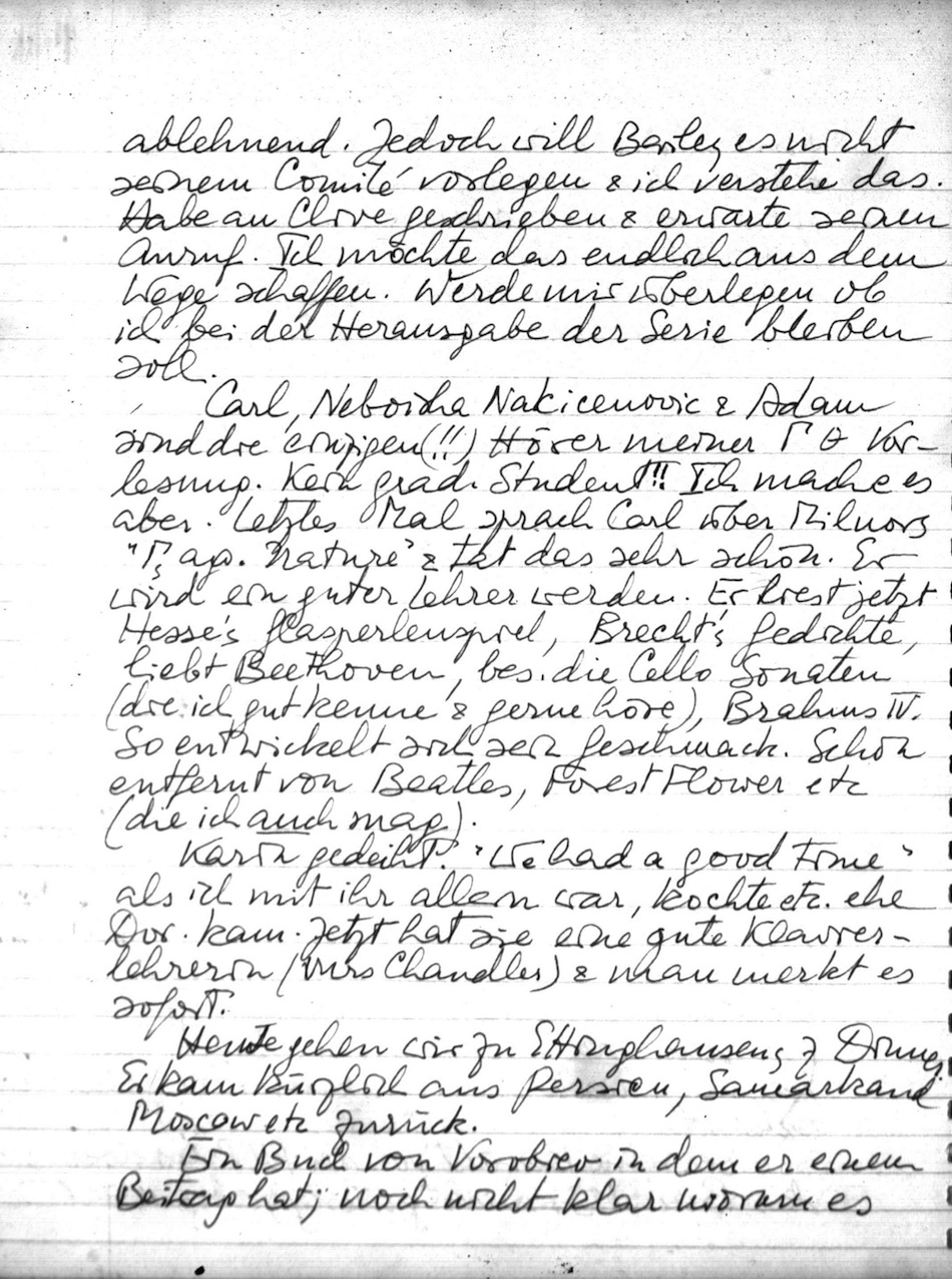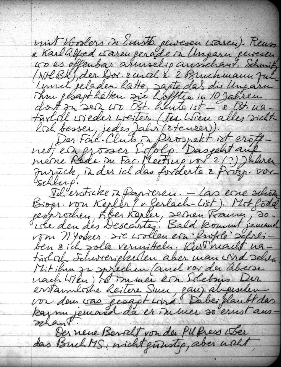 Ich ersticke in Papieren. Las eine schöne Biogr. von Kepler (v. Gerlach-List). Mit Gödel gesprochen, über Kepler, seinen Traum, sowie den des Descartes. Bald kommt jemand vom NYorker; sie wollen ein "Profile" schreiben & ich solle vermitteln. Kurt macht natürlich Schwierigkeiten aber man wird sehen. Mit ihm zu sprechen (auch vor der Abreise nach Wien) ist immer ein Erlebnis. Der erstaunliche heitere Sinn, ganz abgesehen von dem was gesagt wird. Dabei glaubt das kaum jemand da er immer so ernst ausschaut.