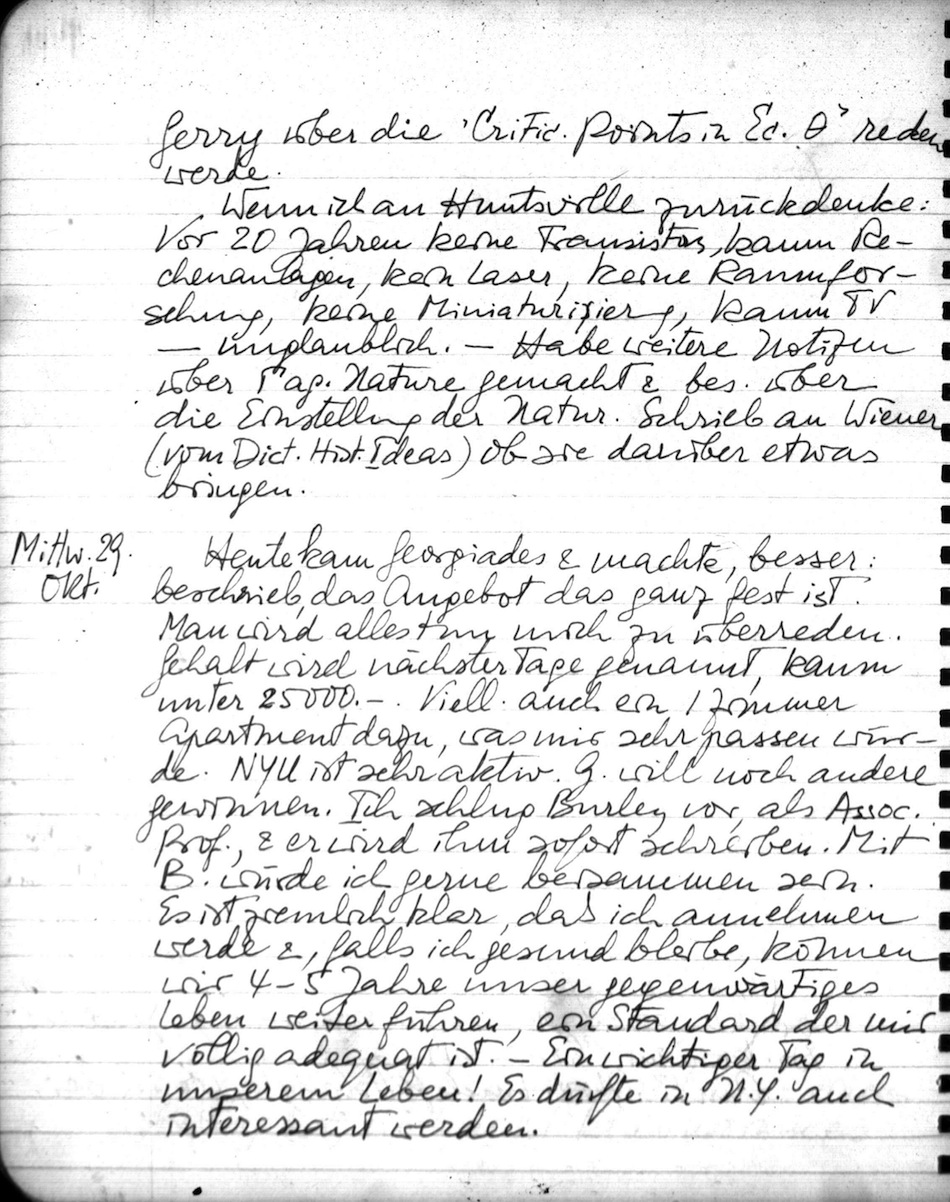 Heute kam Georgiades & machte, besser: beschrieb, das Angebot das ganz fest ist. Man wird alles tun mich zu überreden. Gehalt wird nächster Tage genannt, kaum unter 25 000,-. Viell. auch ein 1 Zimmer Apartment dazu, was mir sehr passen würde. NYU ist sehr aktiv. G. will noch andere gewinnen. Ich schlug Burley vor, als Assoc. Prof., & er wird ihm sofort schreiben. Mit B. würde ich gerne beisammen sein. Es ist ziemlich klar, daß ich annehmen werde &, falls ich gesund bleibe, können wir 4-5 Jahre unser gegenwärtiges Leben weiterführen, ein Standard der mir völlig adequat ist. Ein wichtiger Tag in unserem Leben! Es dürfte in N.Y. auch interessant werden.