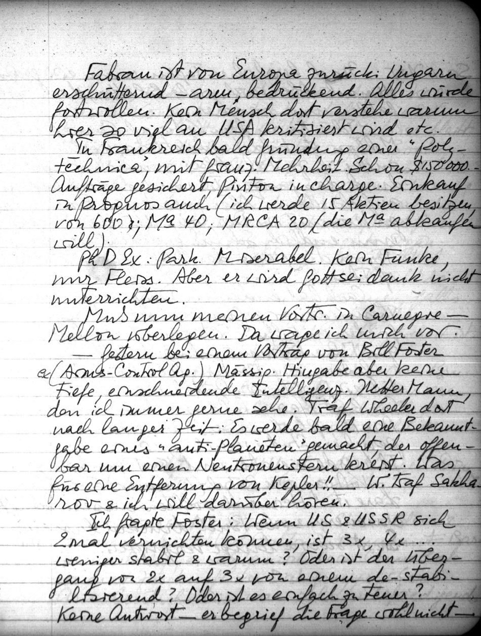 Muß nun meinen Vortr. in Carnegie Mellon überlegen. Da wage ich mich vor. Gestern bei einem Vortrag von Bill Fister ex(Arms-Control Ag.) Mässig. Hingabe aber keine tiefe, einschneidende Intelligenz. Netter Mann, den ich immer gerne sehe. Traf Wheeler dort nach langer Zeit: es werde bald eine Bekanntgabe eines "anti-Planeten" gemacht, der offenbar um einen Neutronenstern kreist. Was für eine Entfernung von Kepler!! W. traf Sakharov & ich will darüber hören.