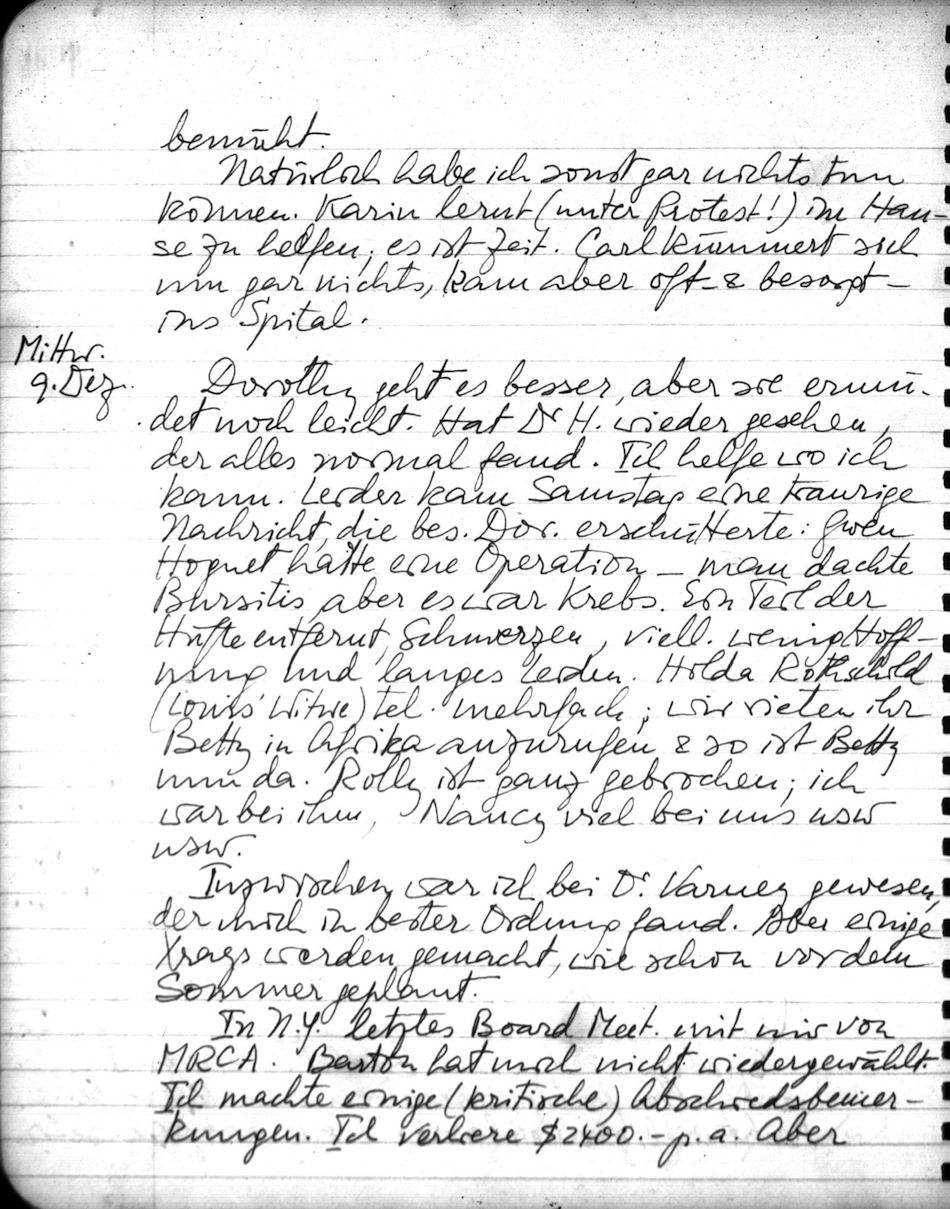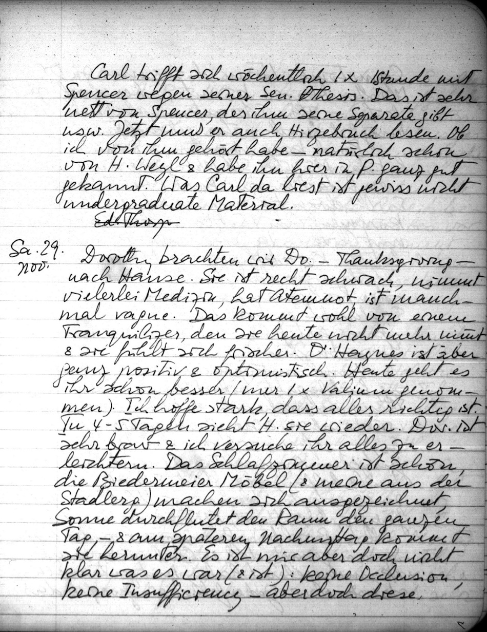 Dorothy brachten wir Do. Thanksgiving nach Hause. Sie ist recht schwach, nimmt vielerlei Medizin, hat Atemnot, ist manchmal vague. Das kommt wohl von einem Tranquilizer, den sie heute nicht mehr nimmt & sie fühlt sich frischer. Dr Haynes ist aber ganz positiv & optimistisch. Heute geht es ihr schon besser (nur 1 x Valium genommen). Ich hoffe stark, dass alles richtig ist. In 4-5 Tagen sieht H. sie wieder. Dor. ist sehr brav & ich versuche ihr alles zu erleichtern. Das Schlafzimmer ist schön, die Biedermeier Möbel (& meine aus der Stadlerg.) machen sich ausgezeichnet, Sonne durchflutet den Raum den ganzen Tag, & am späteren Nachmittag kommt sie herunter. Es ist mir aber doch nicht klar was es war (& ist): keine Occlusion, keine Insufficiency aber doch diese Symptome. Wenn ich sie nur zu Dr Master bringen könnte, aber noch zu früh. Ihre Erkrankung hat uns, wenn möglich noch näher gebracht .