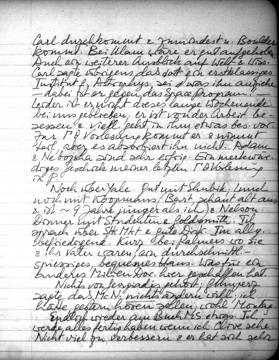 Lunch mit Spencer: Carl sei erstklassig, hochbegabt, netter Mensch. Seine Senior Thesis verspreche sehr gut zu werden, viell. würde sie zu einer Publikation führen. Er, Sp., erfreue sich an den Unterhaltungen jeden Donnerstag. Er wird Carl beraten (& helfen) bez. Grad. School; er solle zu einer guten kommen. U Col. sei angängig, aber Harv, MIT sei besser. (Carl will n. Boulder). Guning in Boulder habe Spencer gesagt, daß er Carl im Sommer kennen gelernt habe, mit gutem Eindruck. usw. Jedenfalls kein Zweifel daß Carl durchkommt & zumindest n. Boulder kommt. Bei Ulam wäre er gut aufgehoben. Auch ein weiterer Ausblick auf Welt & Wiss. Carl sagte übrigens daß dort ein erstklassiges Institut f. Astrophys. sei was ihn anziehe dabei ist er gegen das Space Program! Leider ist er nicht dieses lange Wochenende bei uns geblieben; er ist von der Arbeit besessen & viell. geht in ihm etwas bes. vor. Zur G ? Vorlesung kommt er & nimmt teil, aber es absorbiert ihn nicht. Adam & Nebojsha sind sehr eifrig. Ein merkwürdiges Geschick meiner letzten G ? Vorlesung in P.
