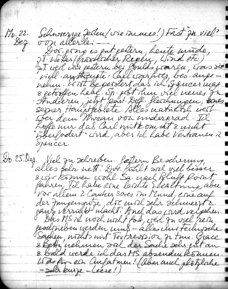Viel zu schreiben. Gestern Bescherung, alles sehr nett. Dor. fühlt sich viel besser & wir können wohl Sa. nach Bluff Point fahren. Ich habe eine leichte Erkältung, aber vor allem 2 Canker sores im Mund; eine auf der Zungenspitze, die mich sehr schmerzt & ganz verrückt macht. Auch das wird vergehen.