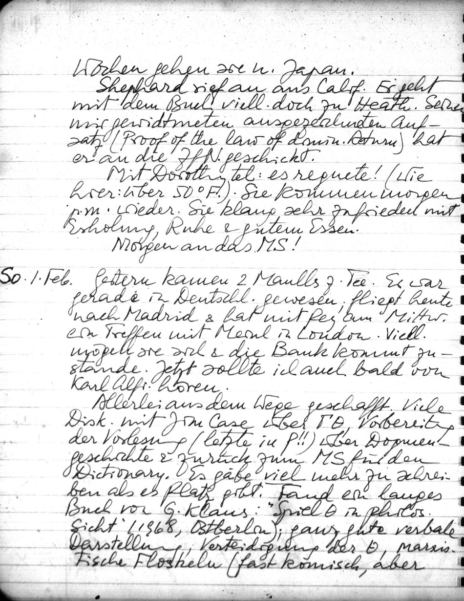 Allerlei aus dem Wege geschafft. Viele Disk. mit Jim Case über G ?, Vorbereitung der Vorlesung (letzte in P!!) über Dogmengeschichte & zurück zum MS für den Dictionary. Es gäbe viel mehr zu schreiben als es Platz gibt. Fand ein langes Buch von G. Klaus: "Spiel ? in philos. Sicht! (1968, Ostberlin); ganz gute verbale Darstellung, Verteidigung der ?, marxistische Floskeln (fast komisch, aber "pathetic") usw. Ich fand das Buch durch Zufall, über 300 Seiten! Der Autor hat auch über Kybernetic geschrieben. Von wirklicher philos. Interpretation nicht viel zu finden, ausser daß G ? eine entscheidende Wende im Denken der Soz.wiss. brachte. Nett von ihm.